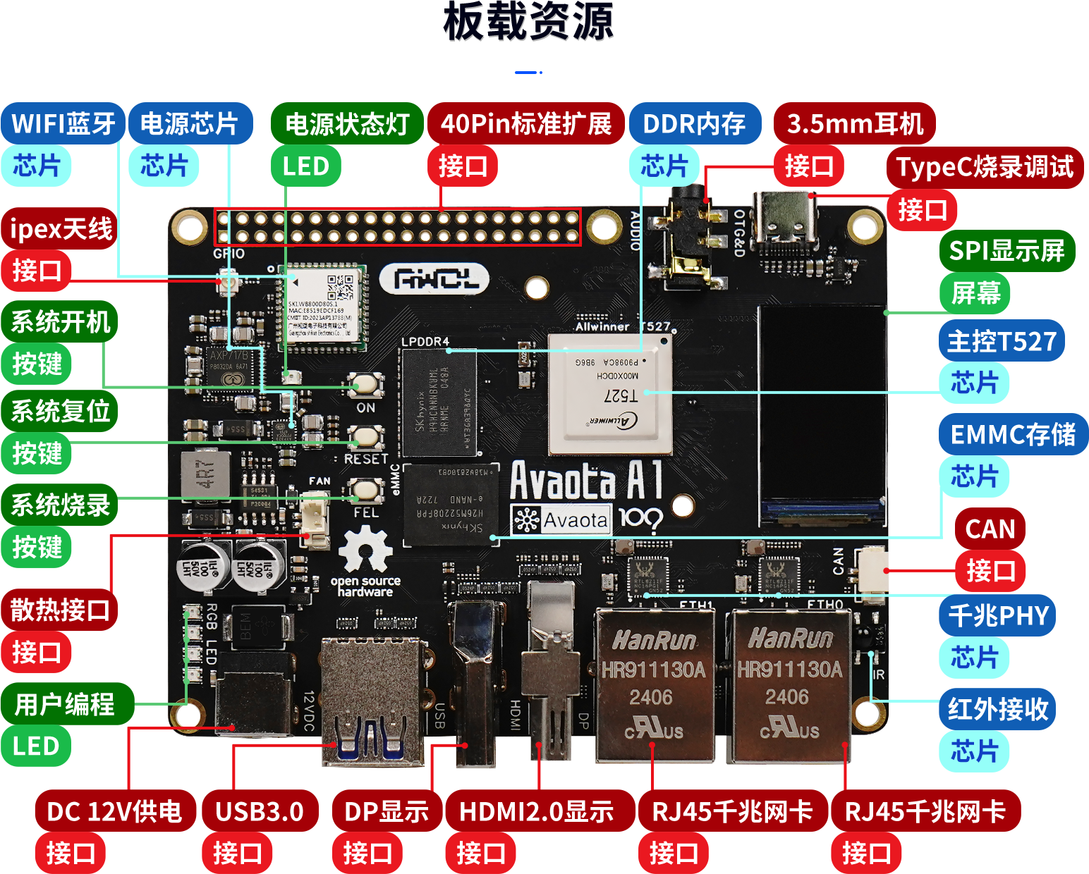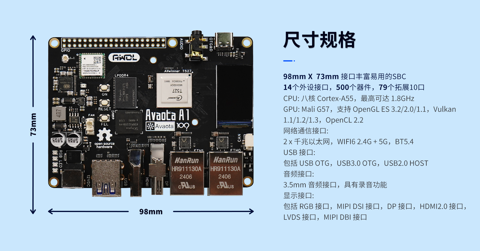 简介:Avaota A1开发板具有 8 核心A55,2TOPS NPU,Mali G57,双千兆,USB,DP,HDMI,WIFI6,BT5.4开源协议