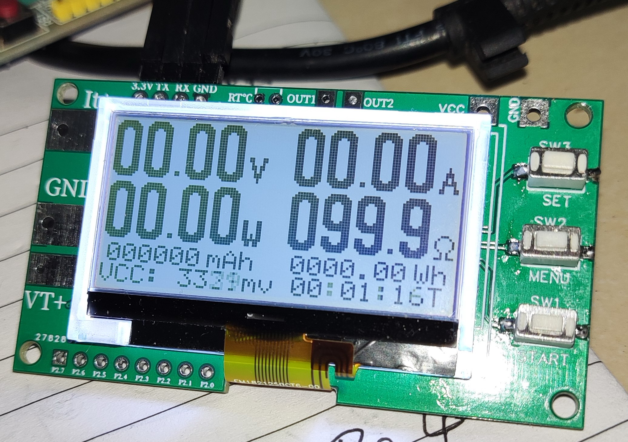 可以同时显示电压电流,负载电阻,没负载时显99.9欧。容量值,能量值,经过的时间,MCU的供电电压等信息。