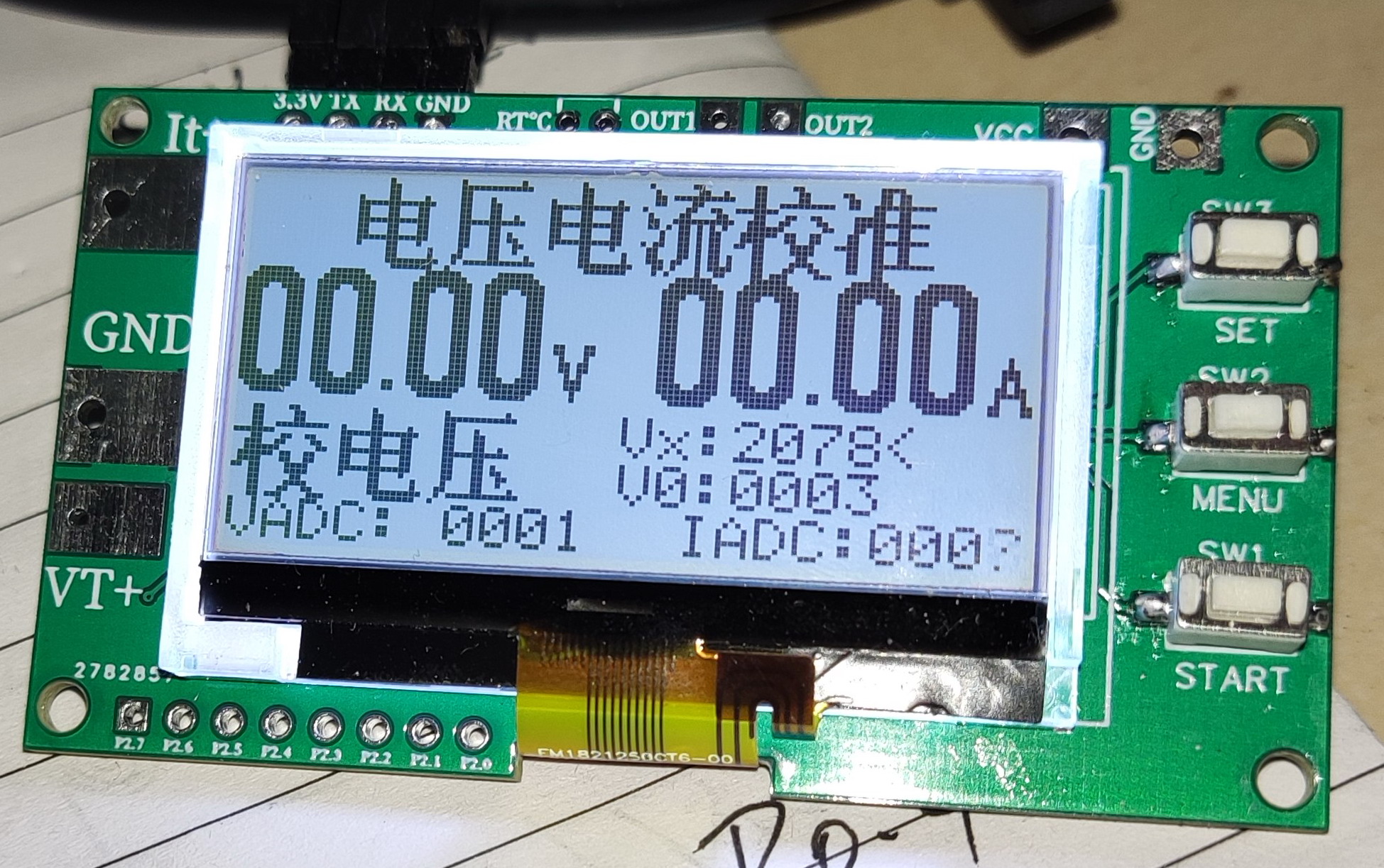 开机后,如果单片机中没有校准数据,自动进入校准程序,按SET键选校准参数,VX为电压分压电阻倍数,在VIN端输入标准电压,按SW2加,按SW2减,调节显示电压与输入标准电压一致。V0为电压的调零值。如果无电压输入时不为零,调为个数量让电压显示0V。