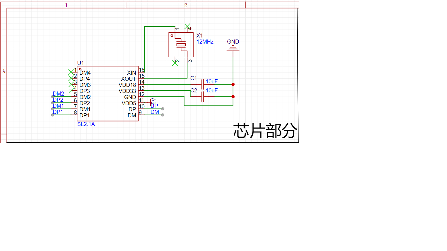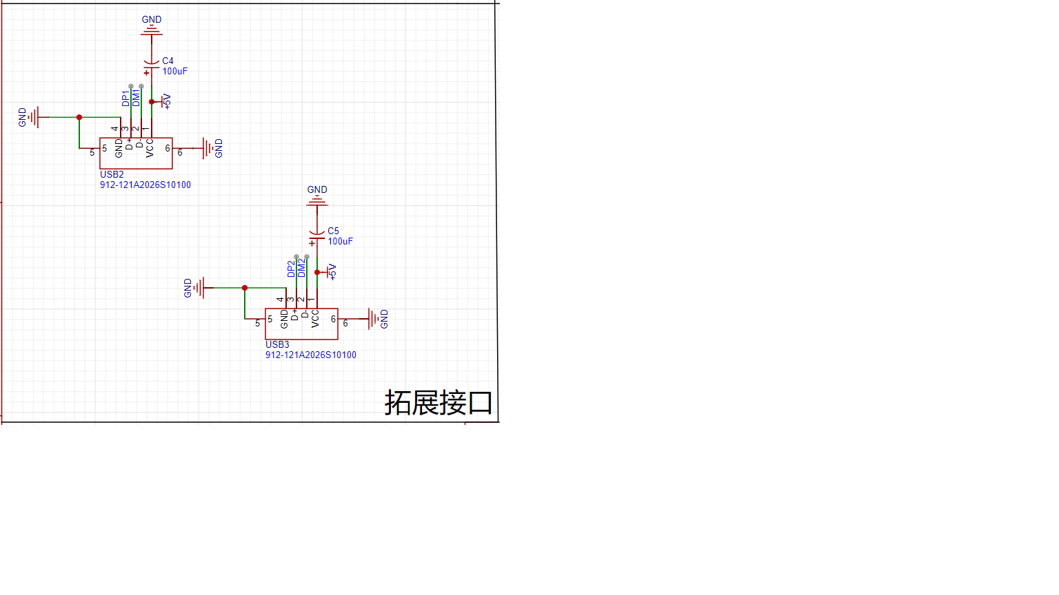 拓展接口的两个母座中间两个引脚分别配置SL2.1A 的下行口1的USB DP信号和下行口1的USB DM信号,下行口2的USB DP信号和下行口2的USB DM信号。同时,两个母座上分别接有一个100uF的电容用于滤波。