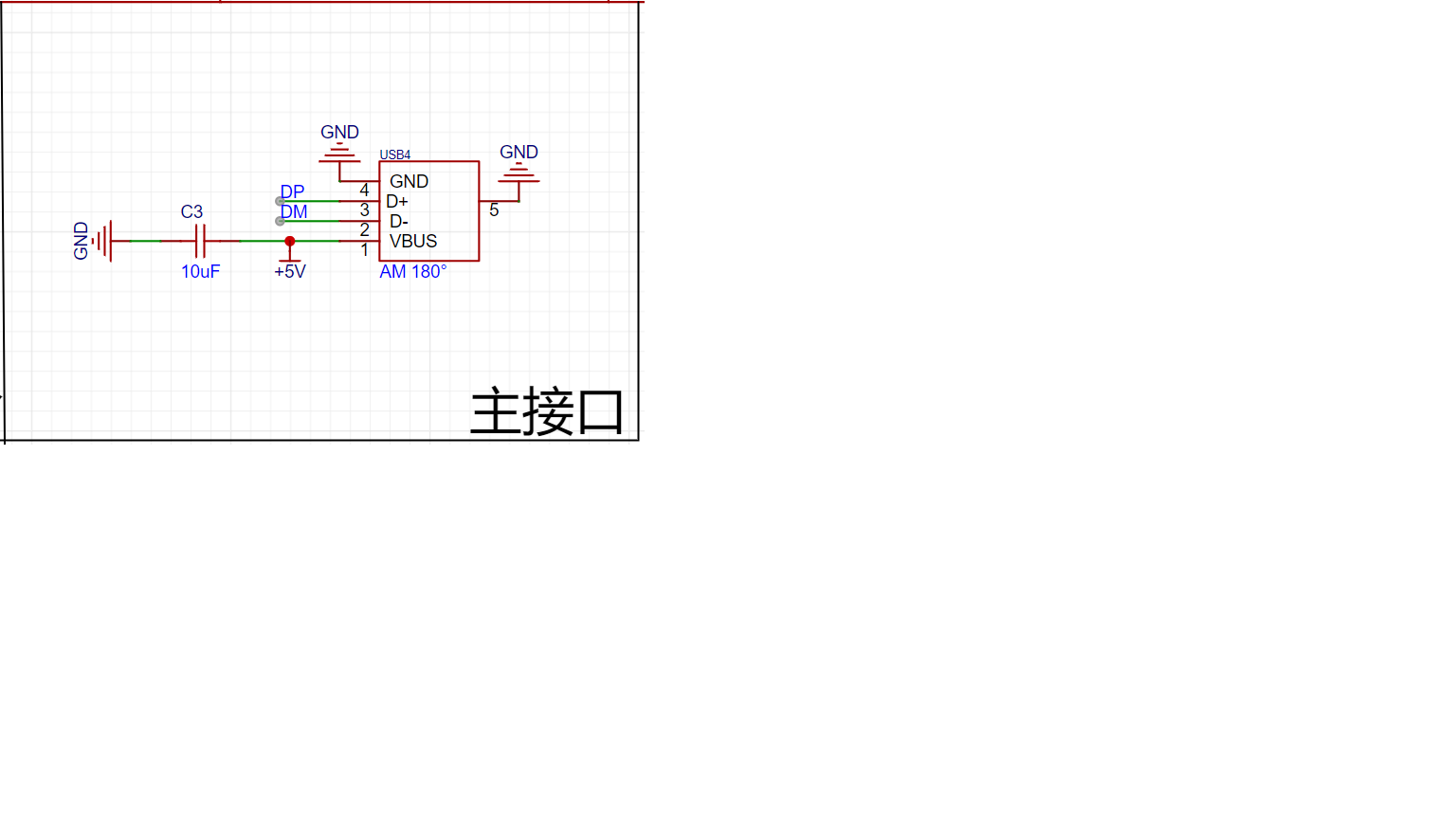 主接口的公头的中间两个引脚分别配置为SL2.1A 的USB上行口DP信号和USB上行口DM信号。同时在主接口的电路中有一个10uF的电容用于谐振和滤波。