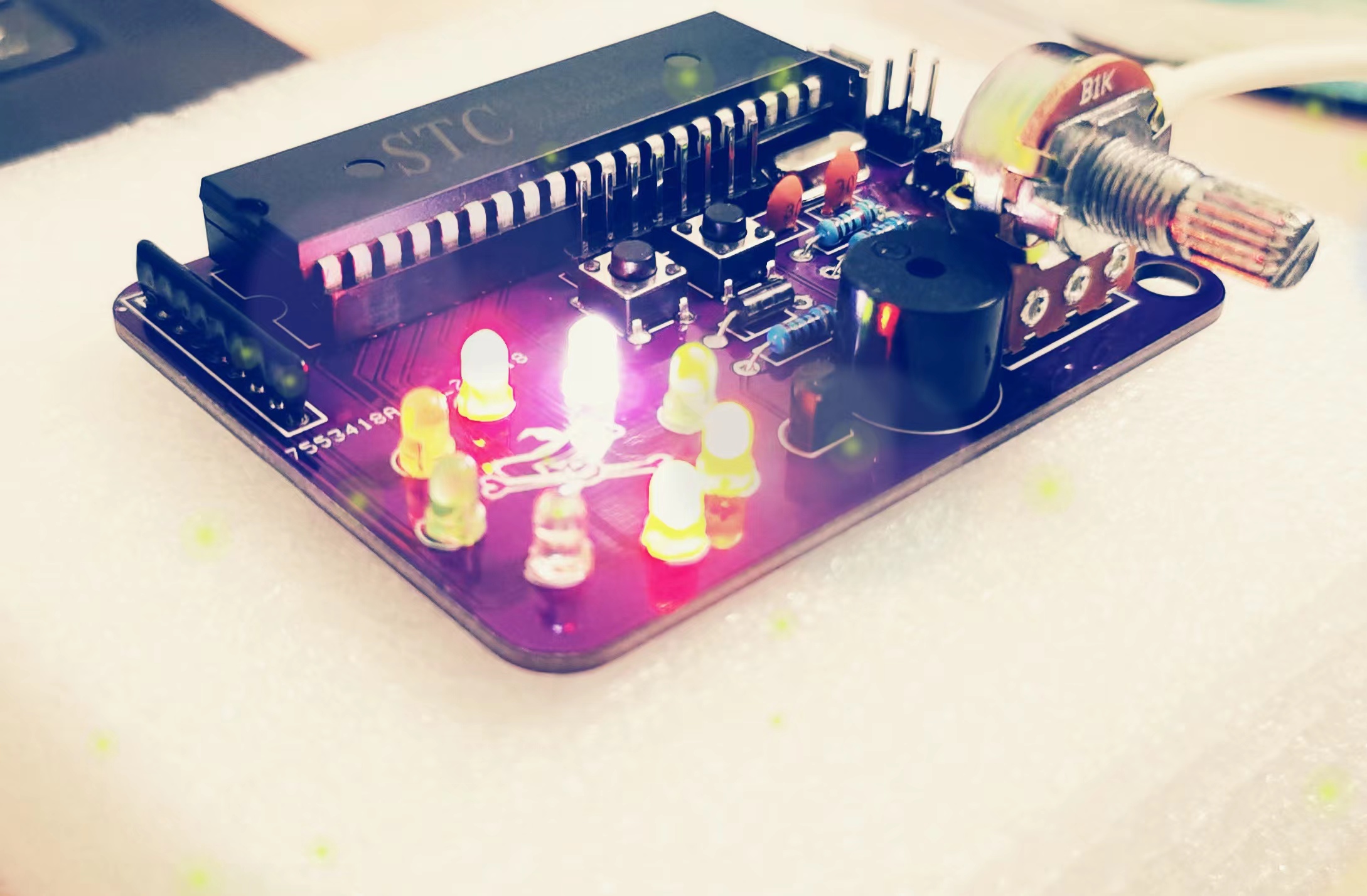 “倾听音乐的流动,感受光影的韵律——音乐与灯光共舞“ 基于51单片机实现音乐盒和流水灯的结合,LED灯可跟随音乐节奏进行闪烁,同时还具有一键切歌、音量可调等功能。
