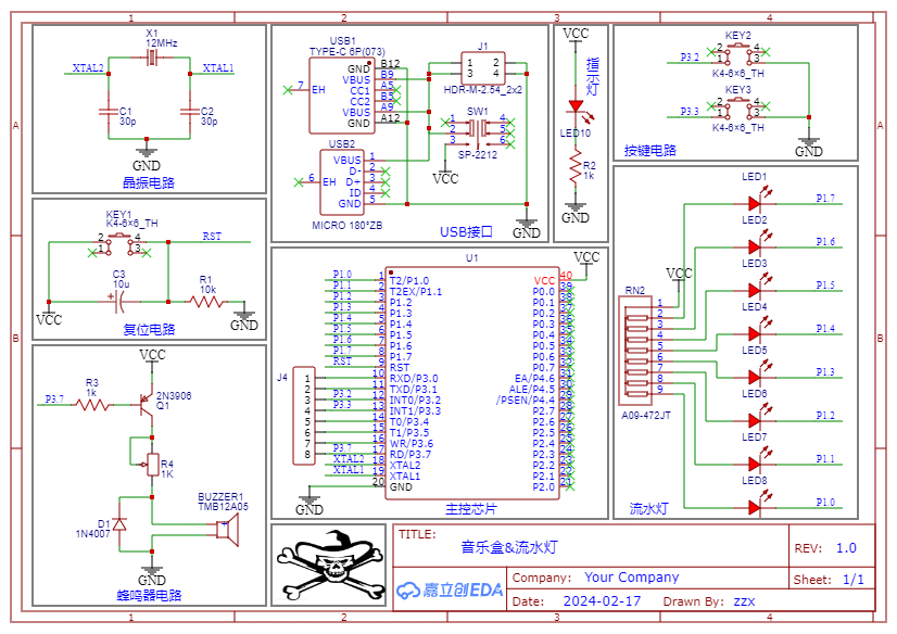 - 上电后默认流水灯状态,蜂鸣器不发声;