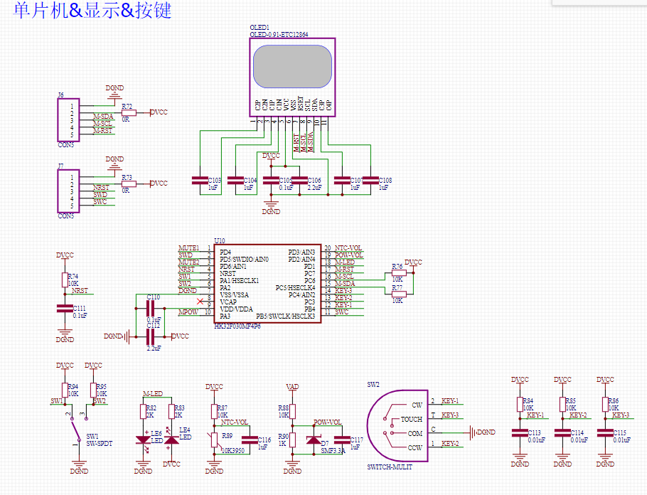 3)使用HK32F030MF4P6,低成本,小体积,单片机。OLED显示器屏(SSD1306),波轮开关(LC商城编号C318951)方便显 示控制。