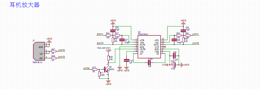 4)耳机放大器使用TPA6138,R56,R57,R60,R61来控制增益, 低失真,免去输出电容。