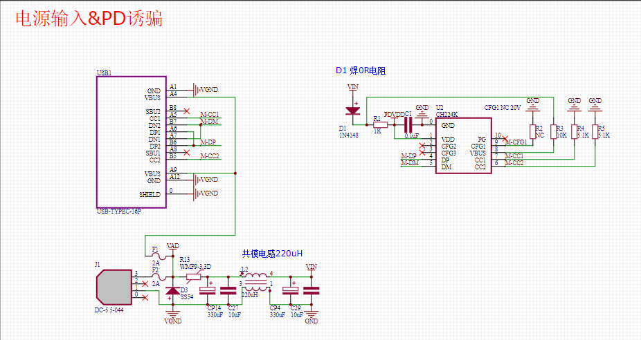 1)电源输入,电源12V-24V供电,也可以使用PD,或QC 适配器供电,CH224K PD会诱骗至20V,也可以用12V的QC适配器。