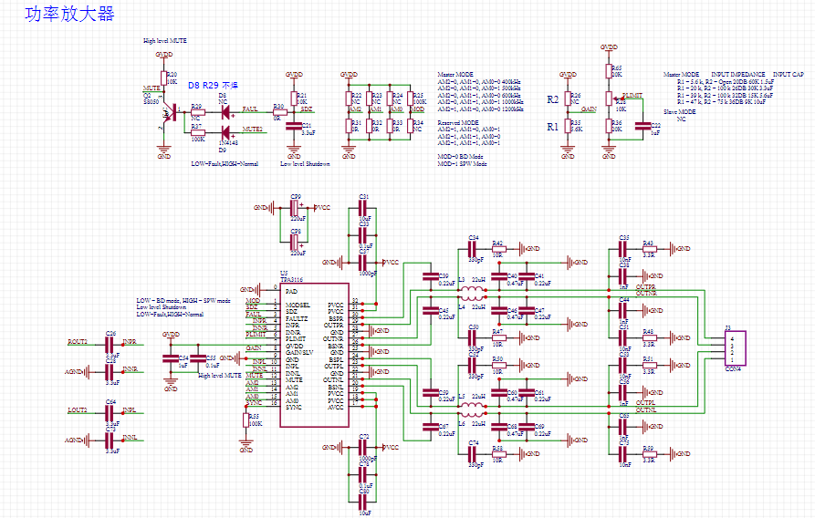 5) 功率放大器采用D类功放,TPA3116或TAP3118。高效率,大功率,小体积,低发热。