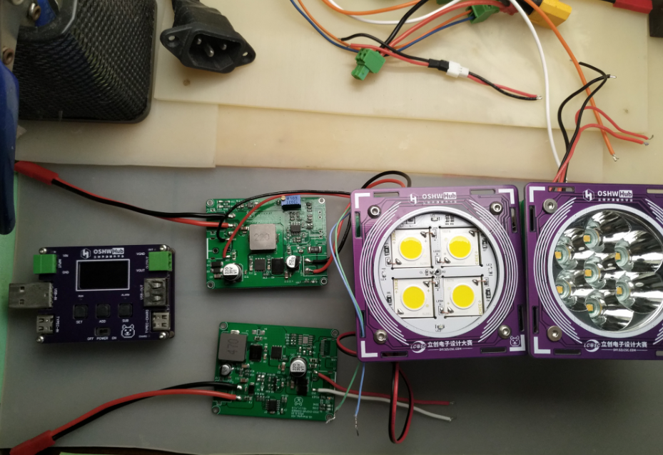 设计2-4串锂电输入,20-36V输出,最大50W,PWM或电位器调光,测试使用4颗36VCOB。效率实测91%+