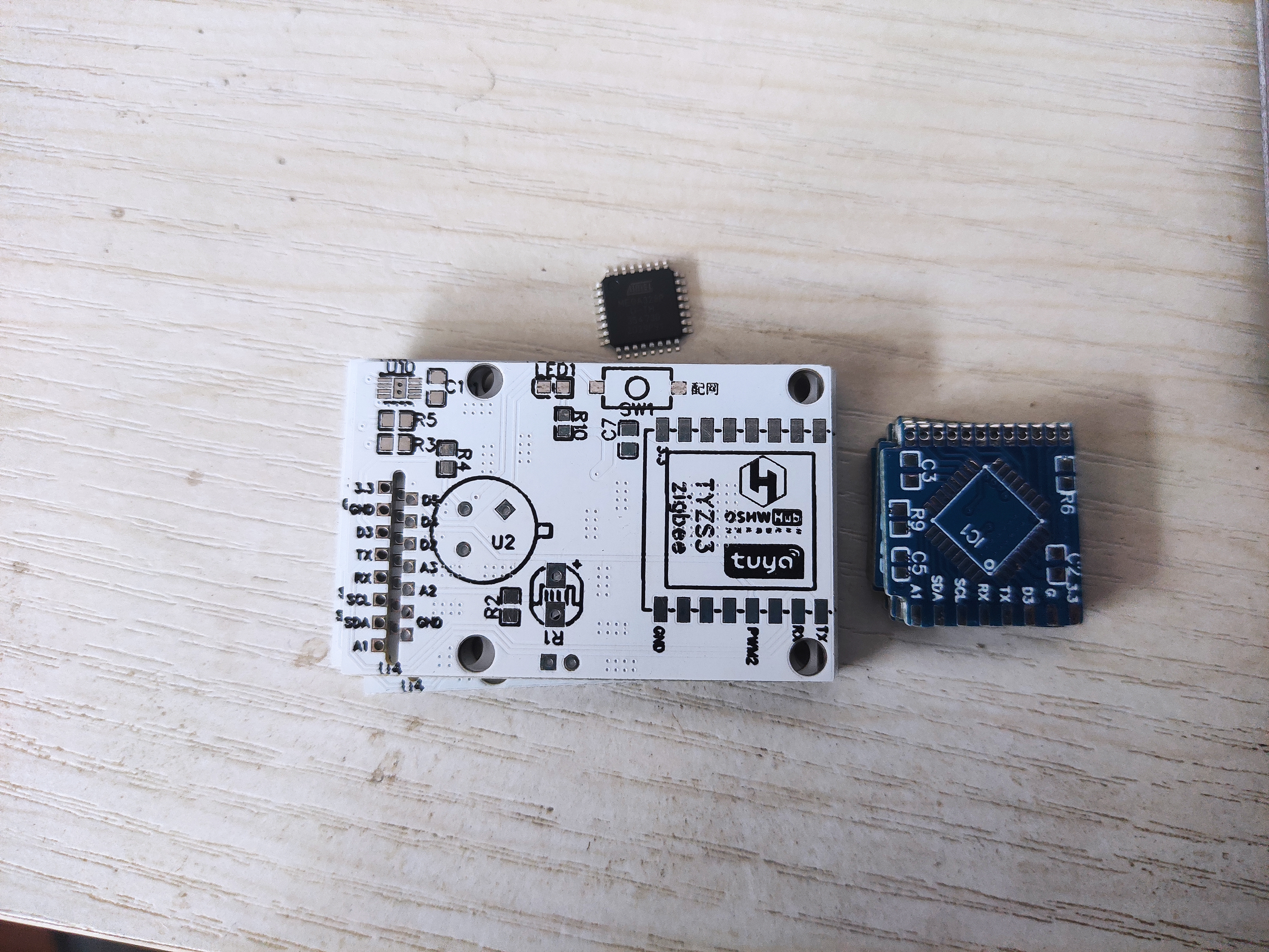 使用Mega328P为主控MCU,接入涂鸦智能TYZS3-Zigbee模块的人体感应+光线感应+温湿度三合一低功耗智能家居传感器。