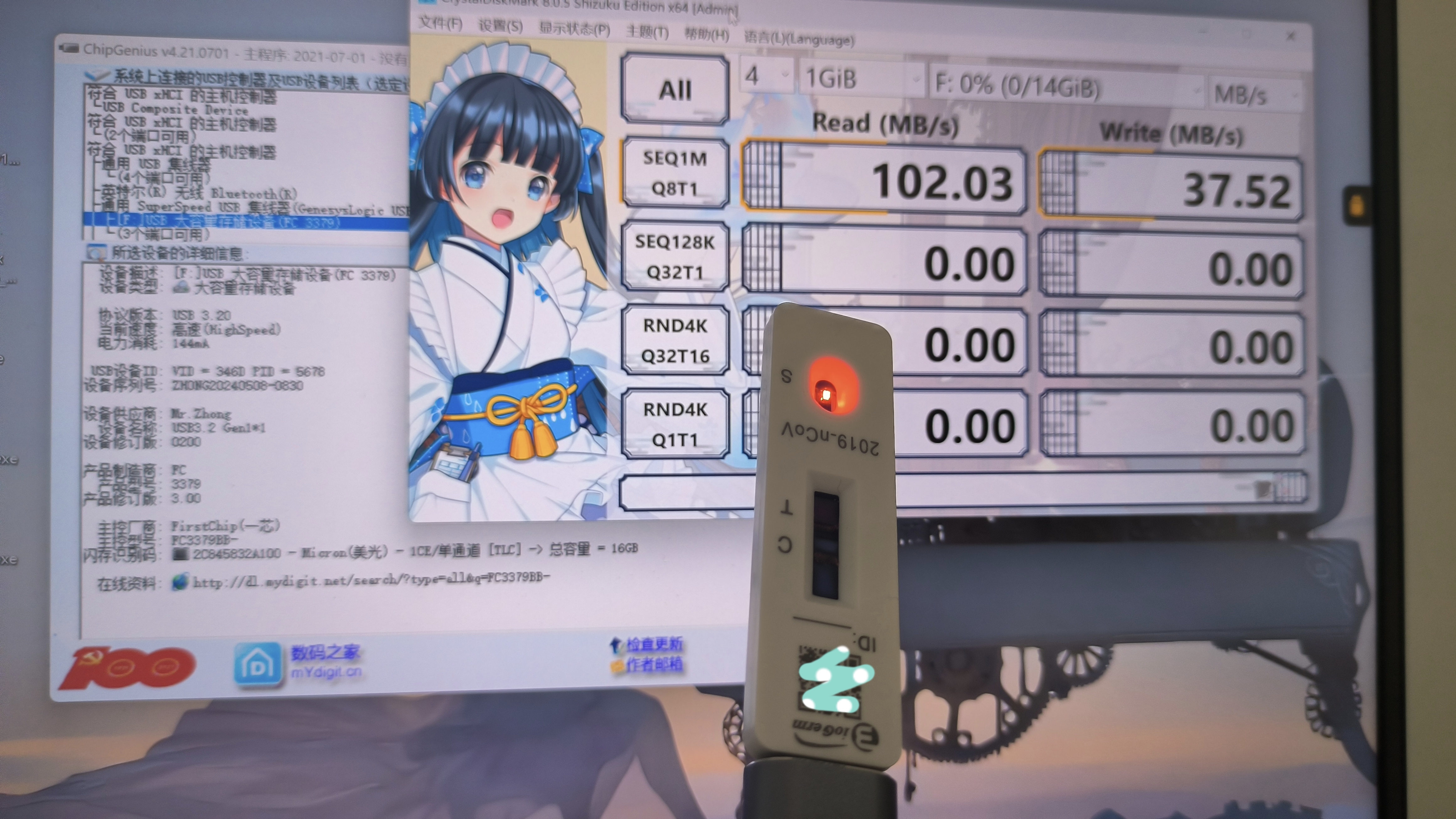 颗粒用的B05A,特别拉跨,所以速度不高,正常来说3379速度读取100~155MB/s,写入25~100MB/s,一般是制程越新越快