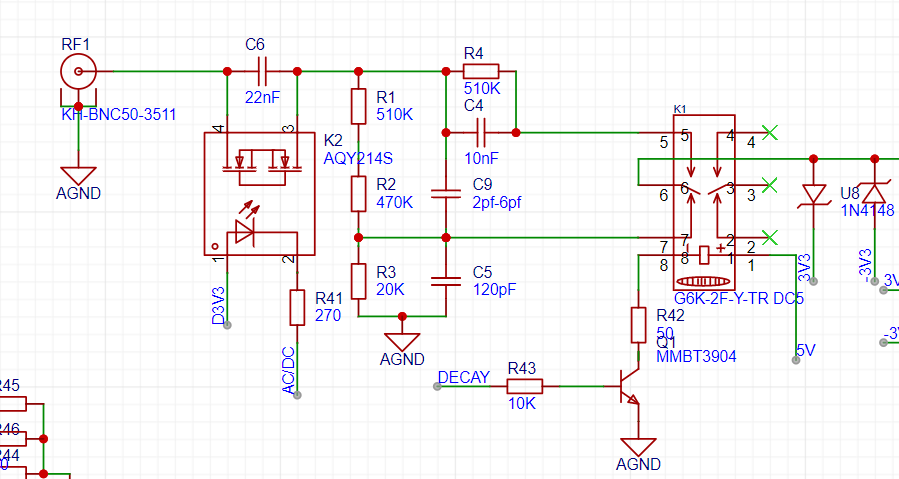 输入采用BNC插座,信号进入一个22nF小电容。该电容与后面的1M电阻网络可构成截止频率1/(2*pi*R*C)=7hz左右的高通滤波器。这样在交流耦合的时候可以滤除直流信号。采用一个光耦,当光耦导通时,可短路掉小电容,那么就时直流耦合,直流电可通过。后面电阻网络构成一个1倍或者1/50倍衰减,通过继电器可以选择是否需要衰减,从而实现较高电压的输入测量。衰减电阻网络需要搭配上电容来进行补偿。继电器后接两个肖特基二极管来限幅,保证运放和FPGA的安全。注意,信号继电器电磁铁有正负极,接反了无法吸合。