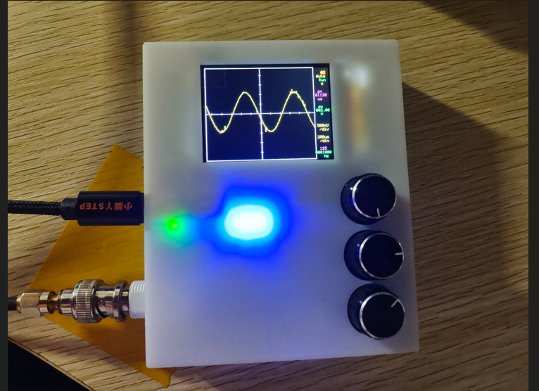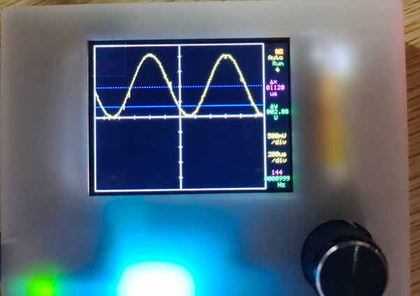 整体如上,有一个屏幕显示,三个编码器可以操作。最下面的编码器可以旋转来调节时基,按下后切换为触发电压调节。中间的编码器可以旋转调节垂直电压挡位,按下后切换为垂直偏移调节。上面的那个编码器是多功能,其余所有的功能都有它来实现。