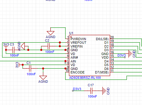 这个是100M高速的ADC电路。该芯片满量程1.024Vpp,差分输入0.512V,自带基准1.25v。所以将基准连到AIN#上,这样就变成了一个单端输入的ADC,输入电压为0.738~1.762V,正好与前级相适应。