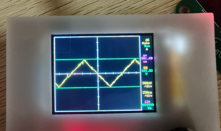 界面如图。有做一个预触发的设计,保证出发点在中心线上。右侧是各个功能,通过旋转上编码器选择功能项,按下可以改变对应功能项。第一行是AC/DC耦合选择。第二行是触发模式,有自动触发、标准触发、单次触发可以选择。第三行是暂停/运行的选择和显示。第四行是上升沿触发/下降沿触发的选择。下面两个是标尺测量,旋转到该选项,屏幕会出现标尺,通过旋转中编码器和下编码器来调节标尺实现测量。再往下两个挡位的显示。最下面绿色的是频率计,采用Verilog实现,通过表述一个数字的滞回比较器形成脉冲,然后去测量这个脉冲在一秒钟的次数计算得到。