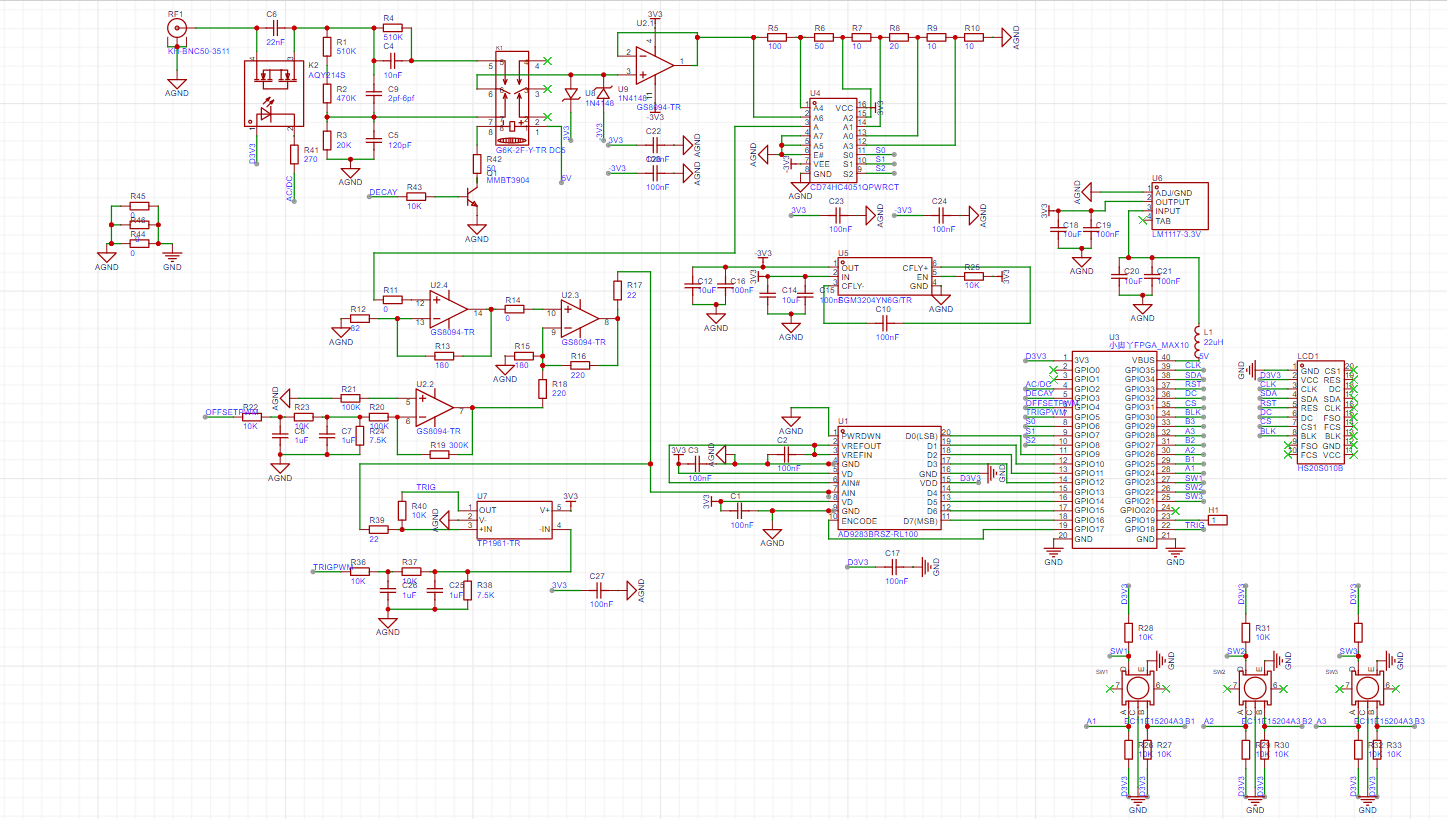 如上图是整体电路图,电路包含:输入衰减、输入跟随、增益选择、信号放大、信号偏移、高速ADC、FPGA部分、LCD显示屏和编码器部分。下面将逐步讲解各部分设计原理。