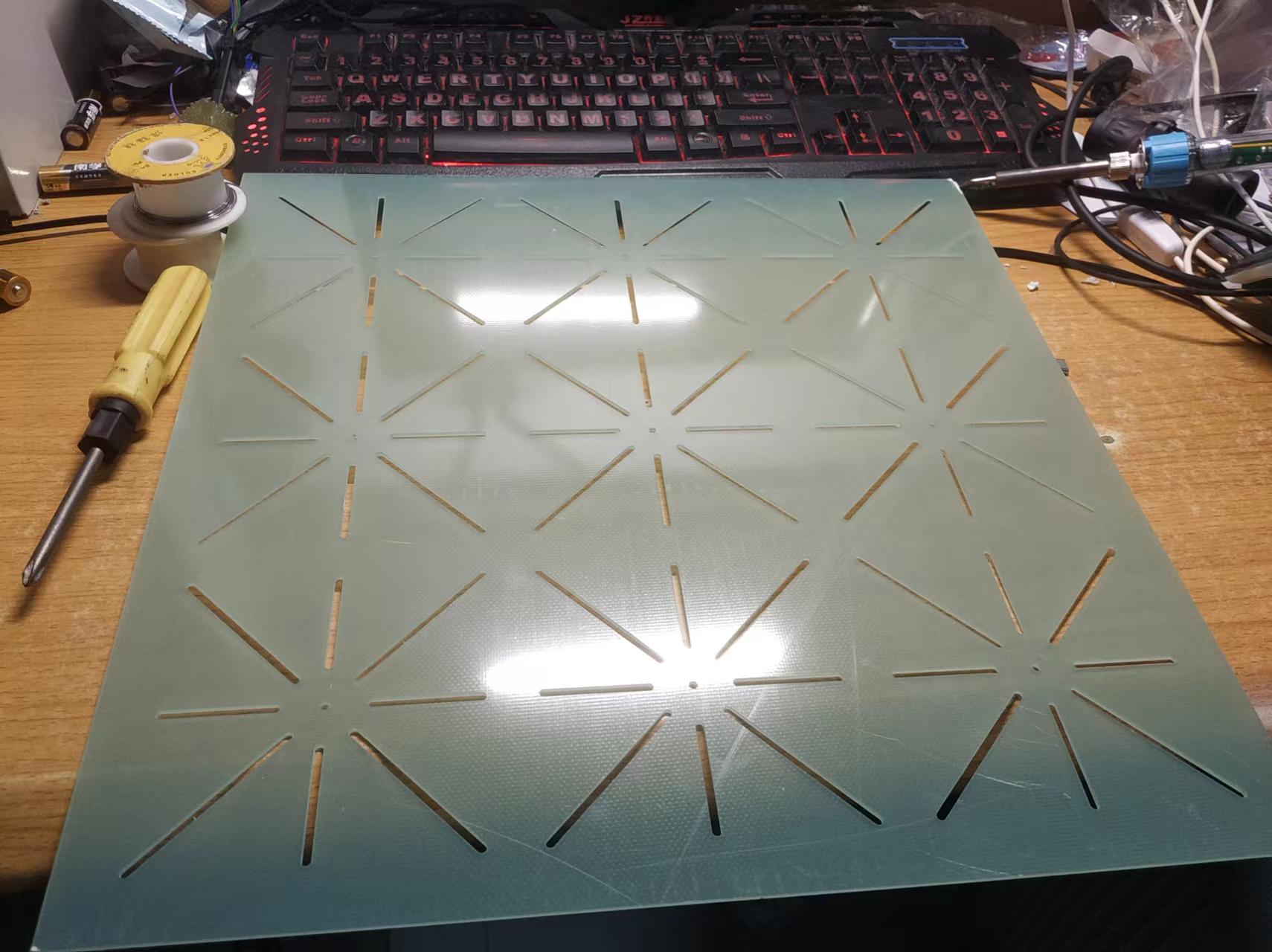 这不是PCB,而是一块机械板材。面积比较大,38cm x 38cm,不建议用PCB做,当然你要用PCB做也不是不行。