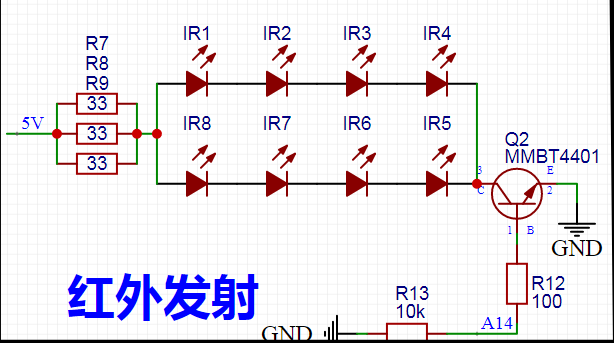 之后是红外发射部分,由于模块IO驱动能力不足,所以加了一个三极管驱动,这里LED多画了一个,画三个串联效果是最好的,一个LED电压是1.2V,四个4.8V加三极管压降,导致发射效果并不好,所以用三个串联最好。