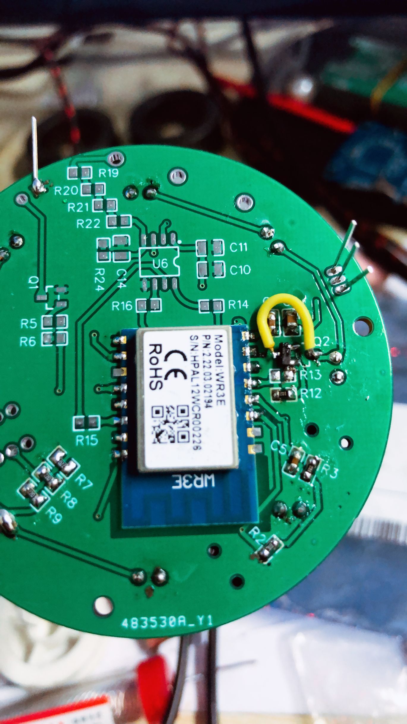 接下来说一下制作过程。首先当然是在涂鸦官网上寻找合适的方案,经过比较选择,发现了一款WR3E的模块比较适合,可以用来计量电量,还可以加继电器来控制大功率电器,当然由于我设计的板子体积有限,只加入了红外遥控跟红外学习功能,其余的功能在板子上都预留出来了,可以再画外一个底板配合就能使用其他功能了。红发射管使用的是3mm白色波长940nm,红外接收管准备采用HS0038。效果有待组装完成后测试。(后来使用的1838,铁壳的哪个,淘宝两毛一个还包邮)