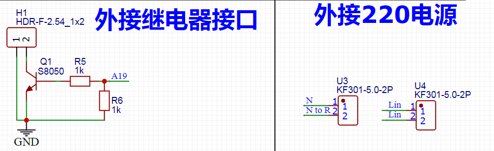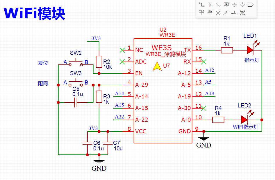 核心部分,WiFi模块。这一部分是根据管网图加配置固件绘制的。留了两个指示灯,一个WiFi配网指示灯,还有一个继电器开关指示灯。