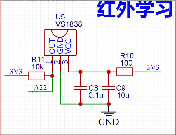 这是红外学习部分,这一部分是按照官网给的原理图画的,没有什么好说的,重点是不要忘记加入那个上拉电阻。