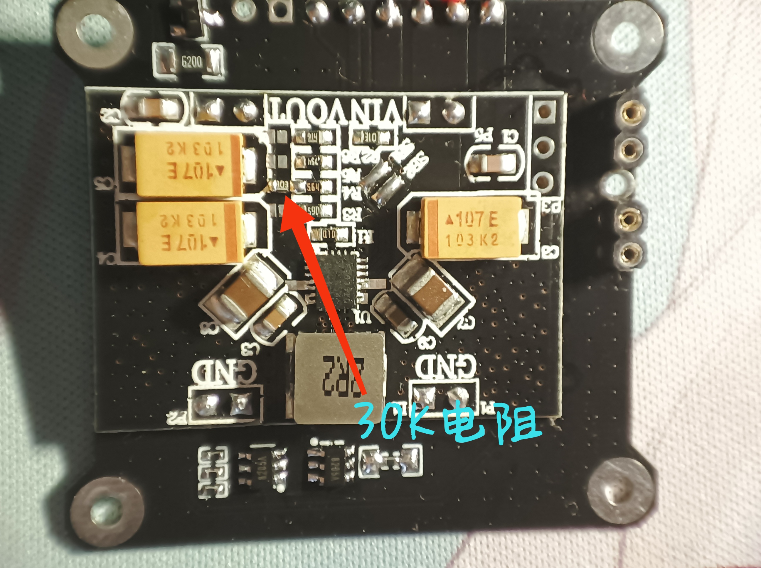 TPS63020模块把电压选择的短接点划开,此处串接一个30K电阻调整输出电压到3.45V,改好后先测试电压是否正常。用铜丝焊到PCB上。