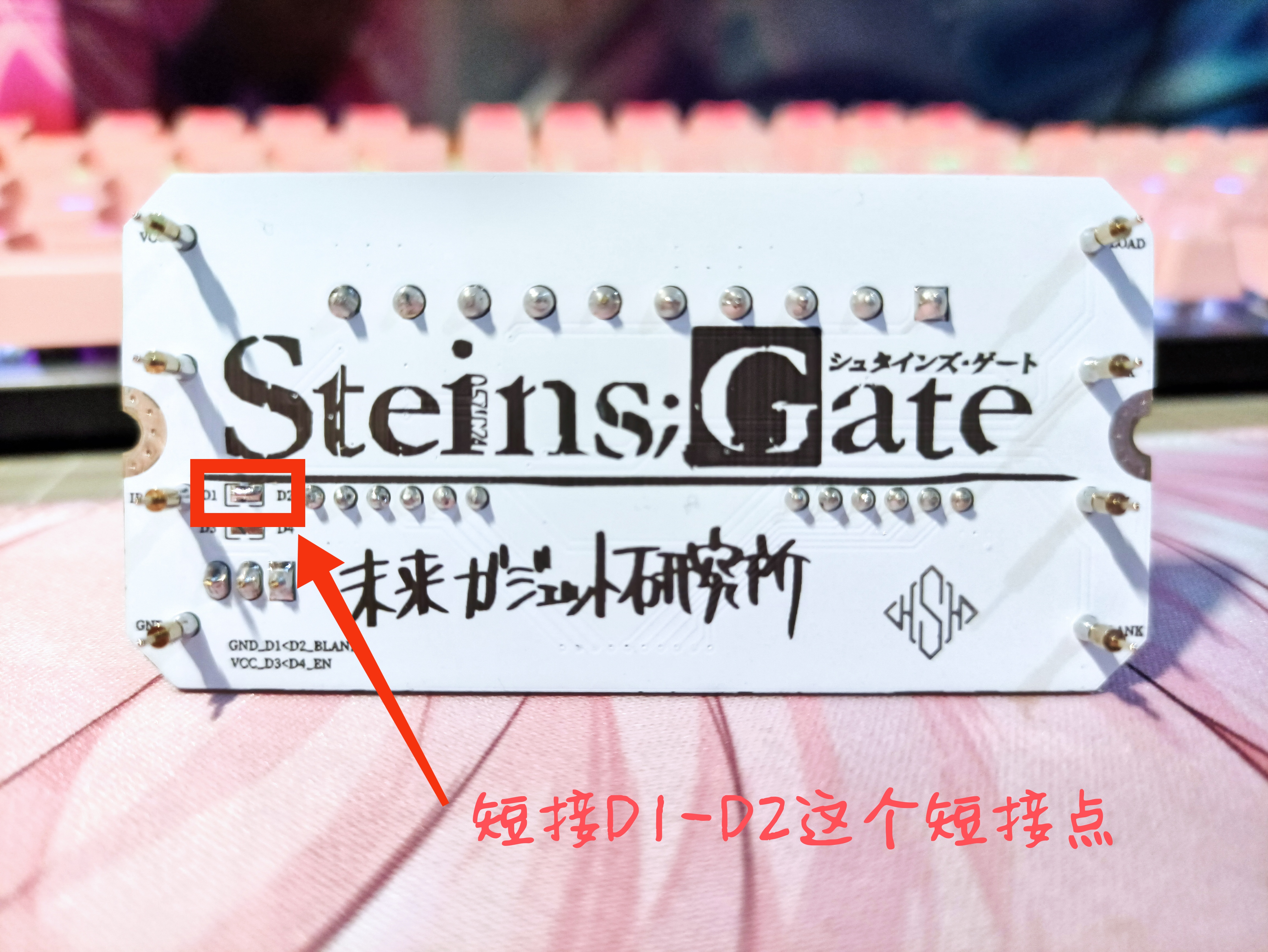 底部有两个短接点,D1-D2短接把HV5812芯片BLANK拉低点亮VFD,也可通过模块引脚输入PWM信号控制VFD亮度,默认短接。D3-D4短接使VFD驱动电路使能,默认断开。