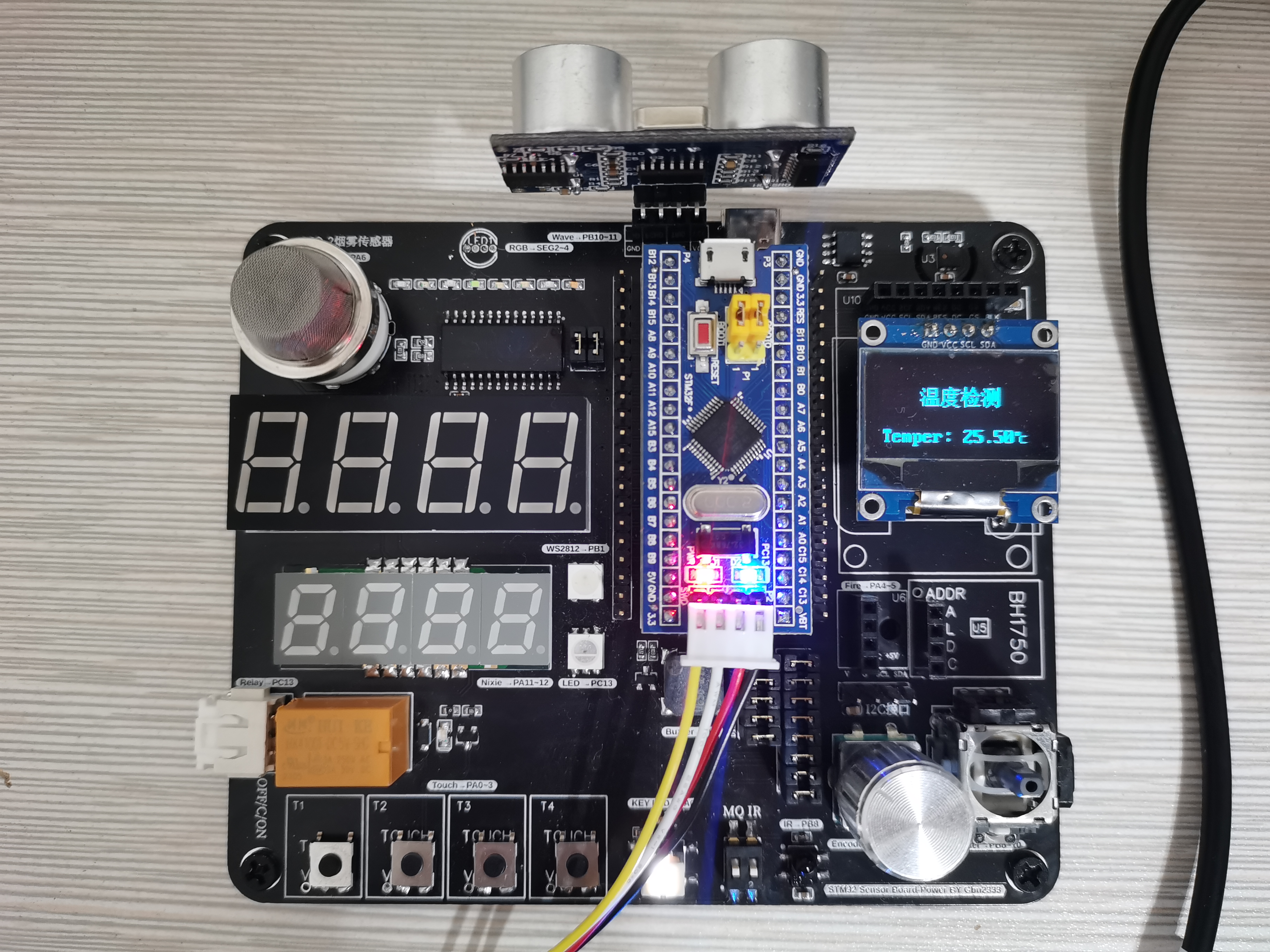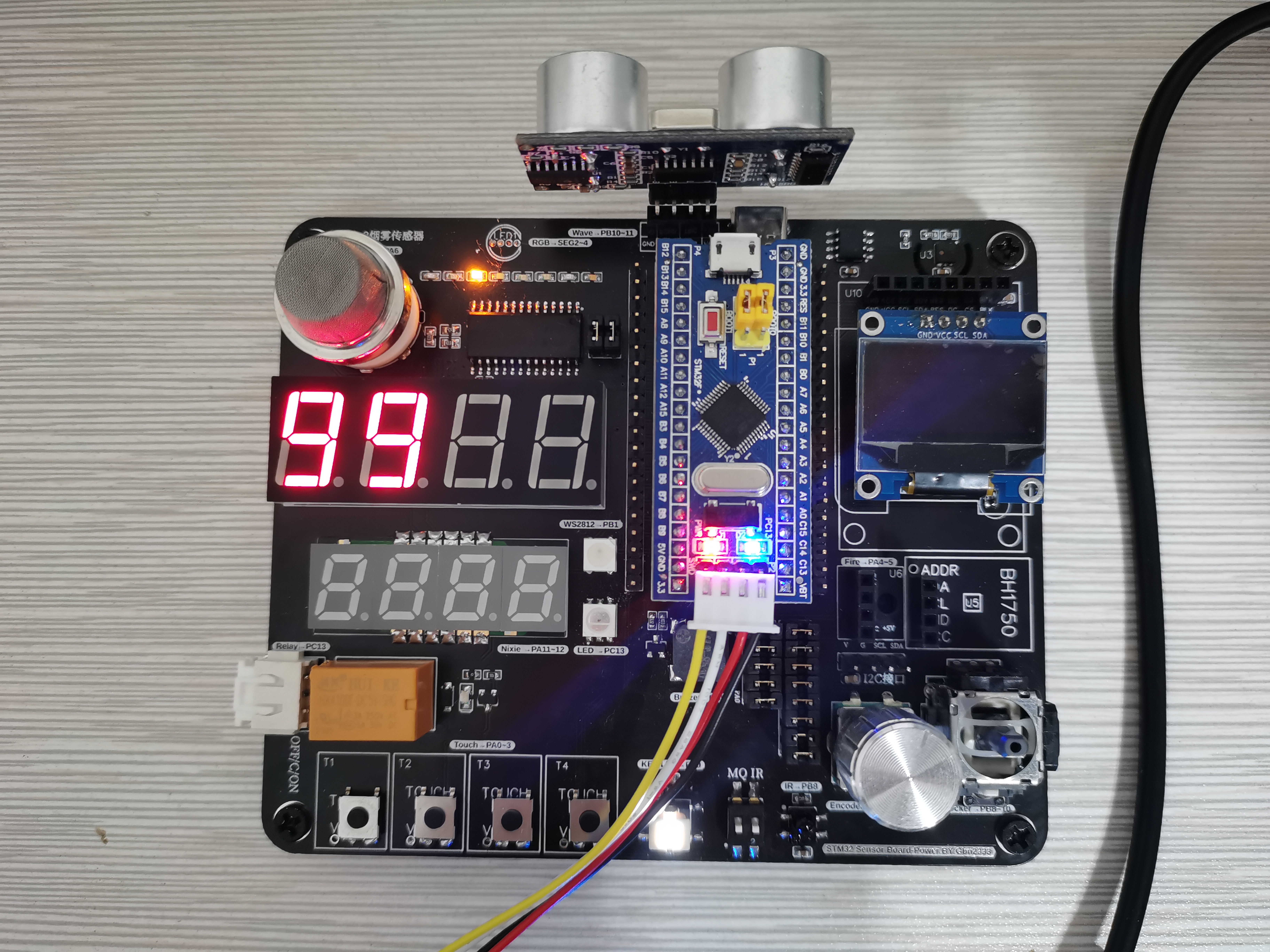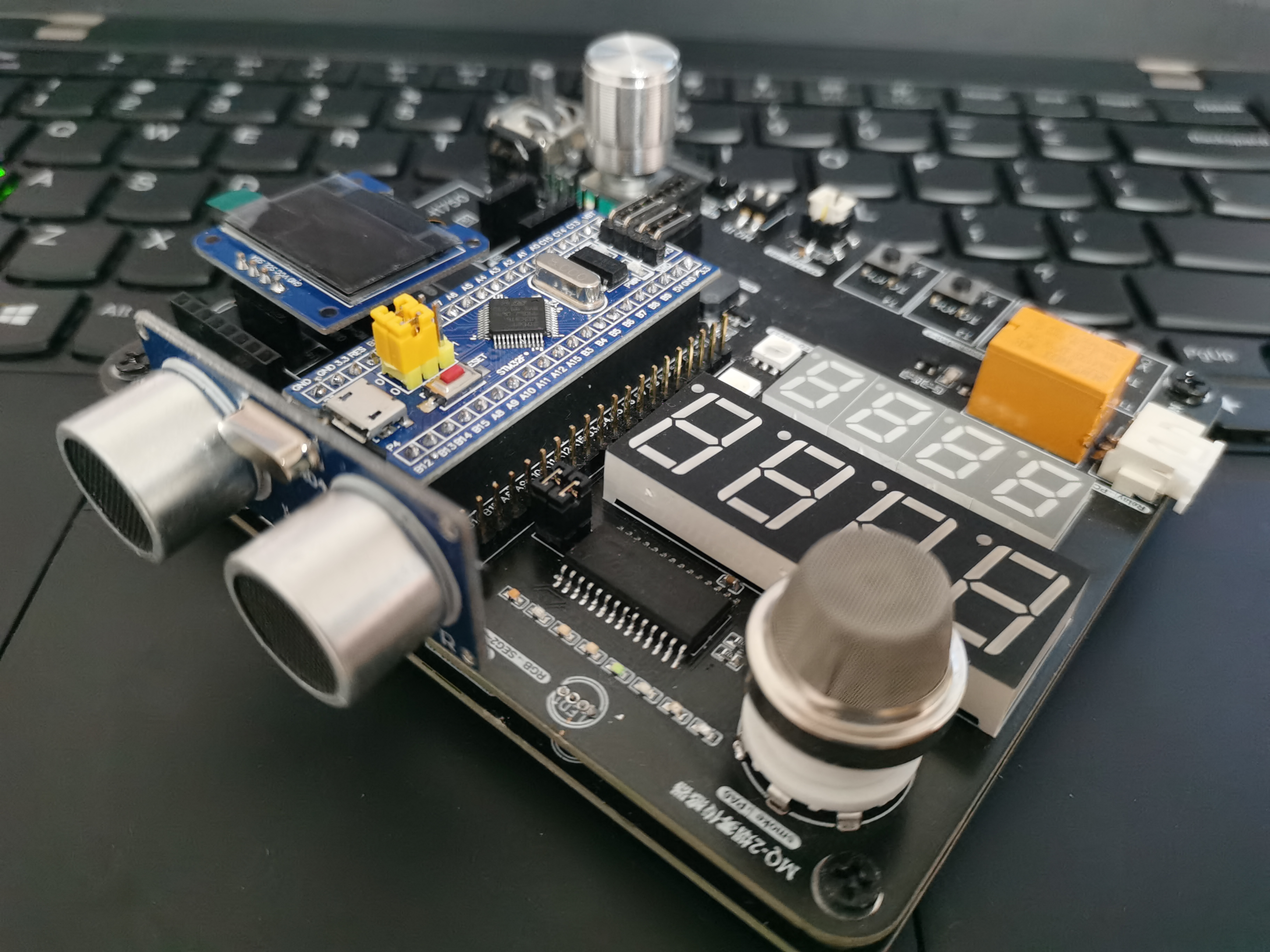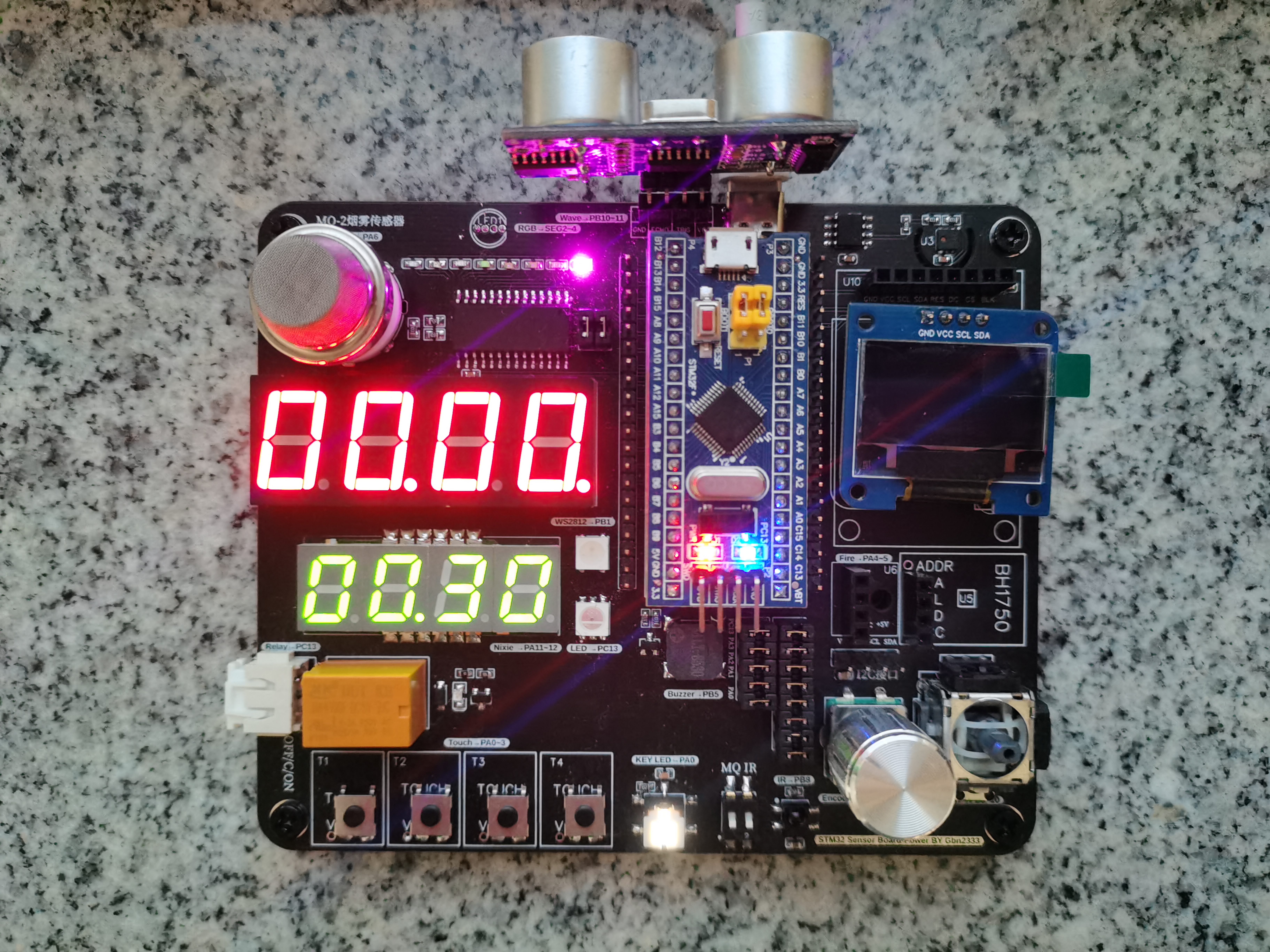 该PCB集成了LED、8位数码管、继电器、按键*4、唤醒按键、烟雾传感器、红外传感器(未验证)、四向摇杆、蜂鸣器、0.96OLED、编码器等功能。