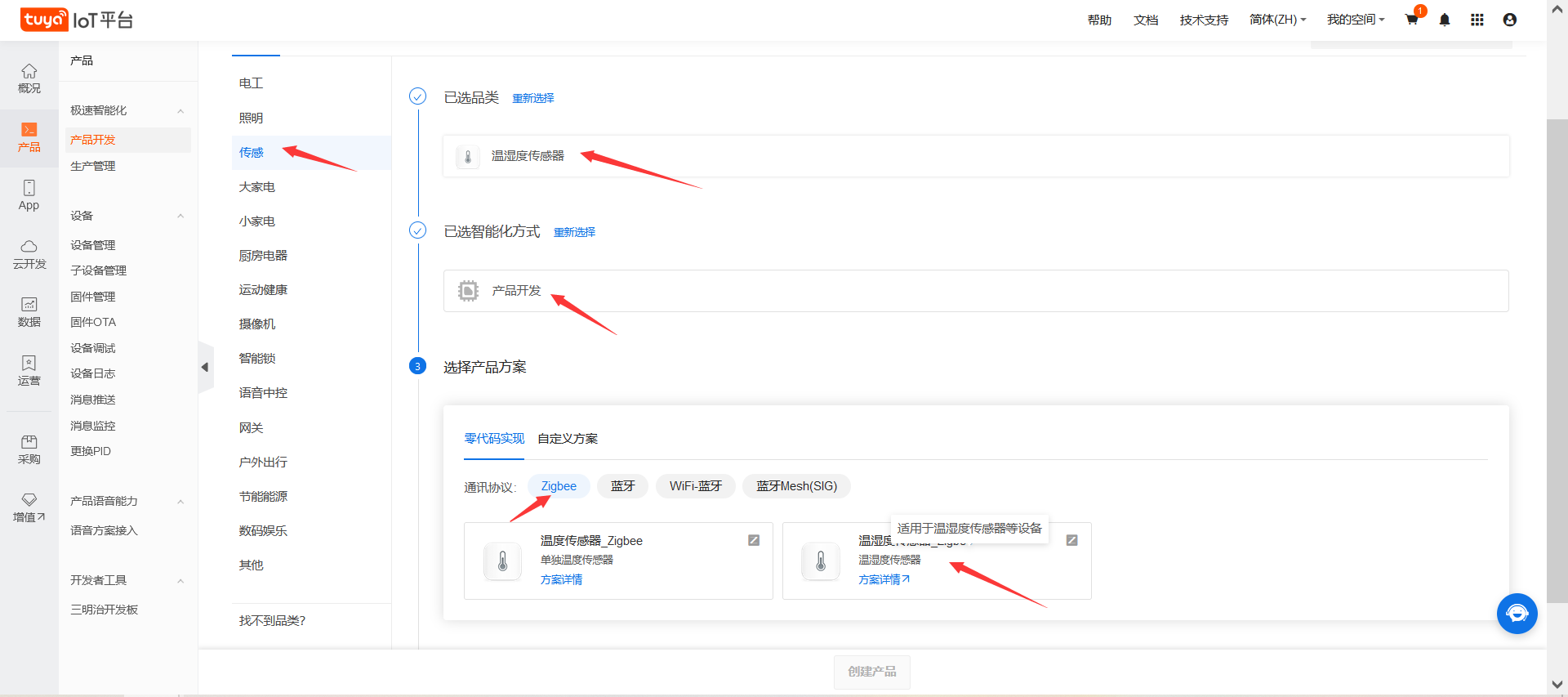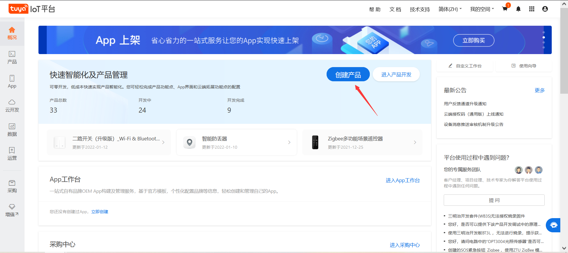 第一步:首先进入涂鸦IOT官网 点我进入 点击左面的概况,再点击创建产品。