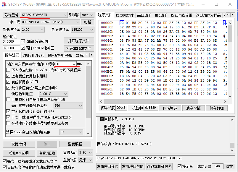 使用STC_ISP下载程序时,使用串口下载方式,并且填写内部IRC频率为:10MHZ,已经附有编译好的HEX文件(见下图),直接烧录即可。推荐使用3.6V的LIR2032可充电锂电池,保证足够的亮度
