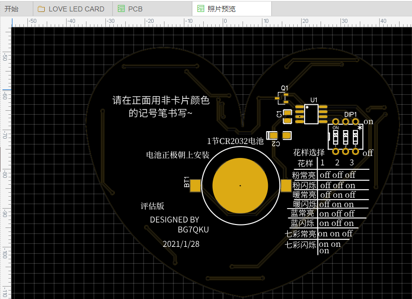 除了用用记号笔写对ta说的话在焊好的PCB贺卡上,也可用LCEDA打开PCB.JSON文件,画其他图文上去。