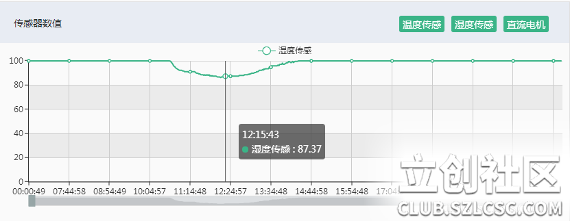 云端湿度曲线:根据十几天观察的经验值,当白天湿度小于70%的时候就需要浇水了。