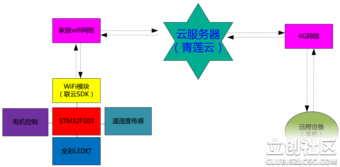 WiFi模块内部烧录好能够连接云端的SDK,这样能够保证系统正常的连接到云端,顺利的将数据上传到云,并且WiFi模块能够接受远程设备推送来的消息,然后将其传给STM32,从而使整套系统可以与云端对话。