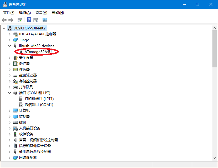 使用USB线连接变色龙和电脑,在设备管理器中查看是否识别到atxmega32a4u。非win10电脑请先安装驱动程: