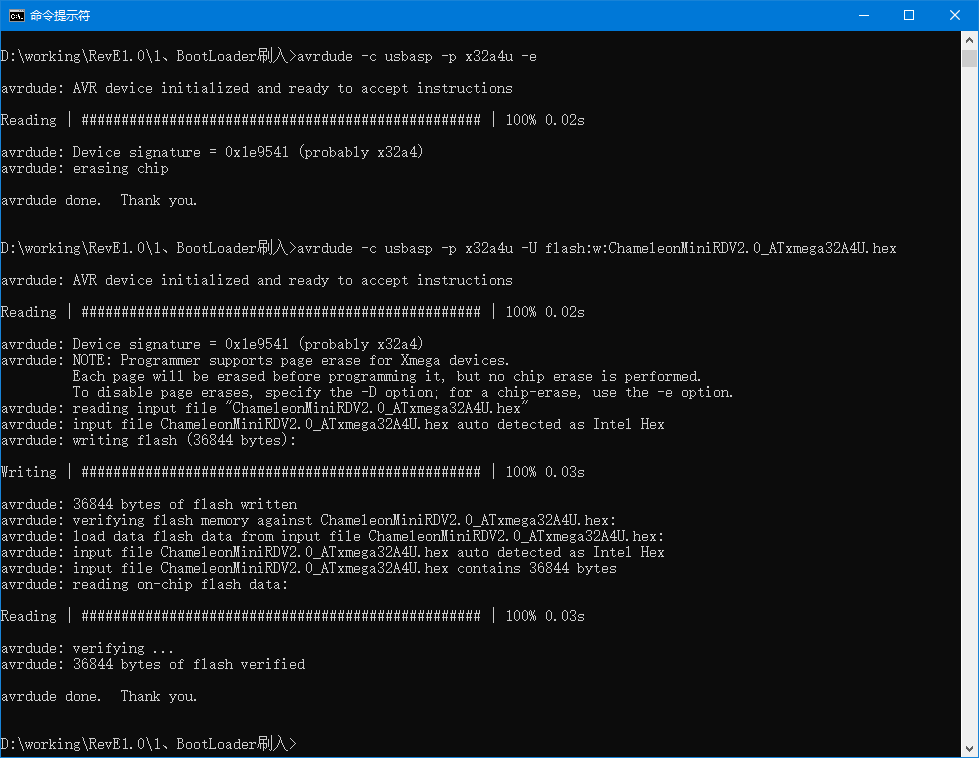 avrdude -c usbasp -p x32a4u -U flash:w:ChameleonMiniRDV2.0_ATxmega32A4U.hex