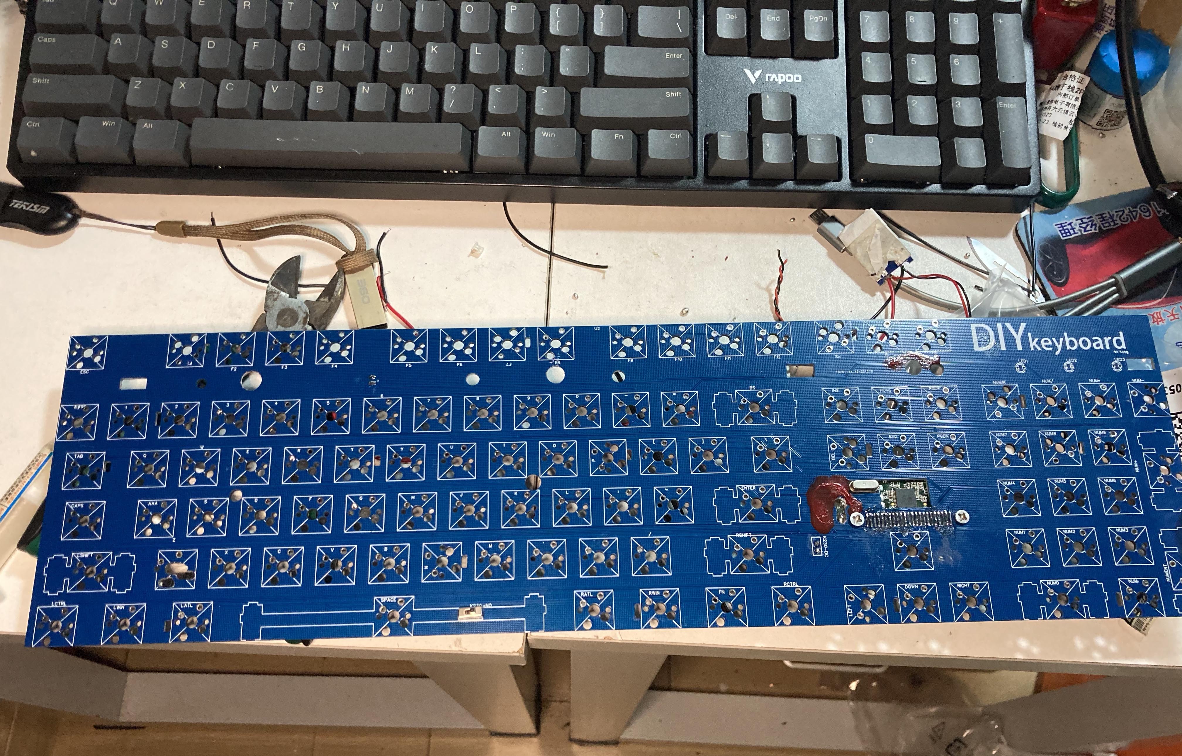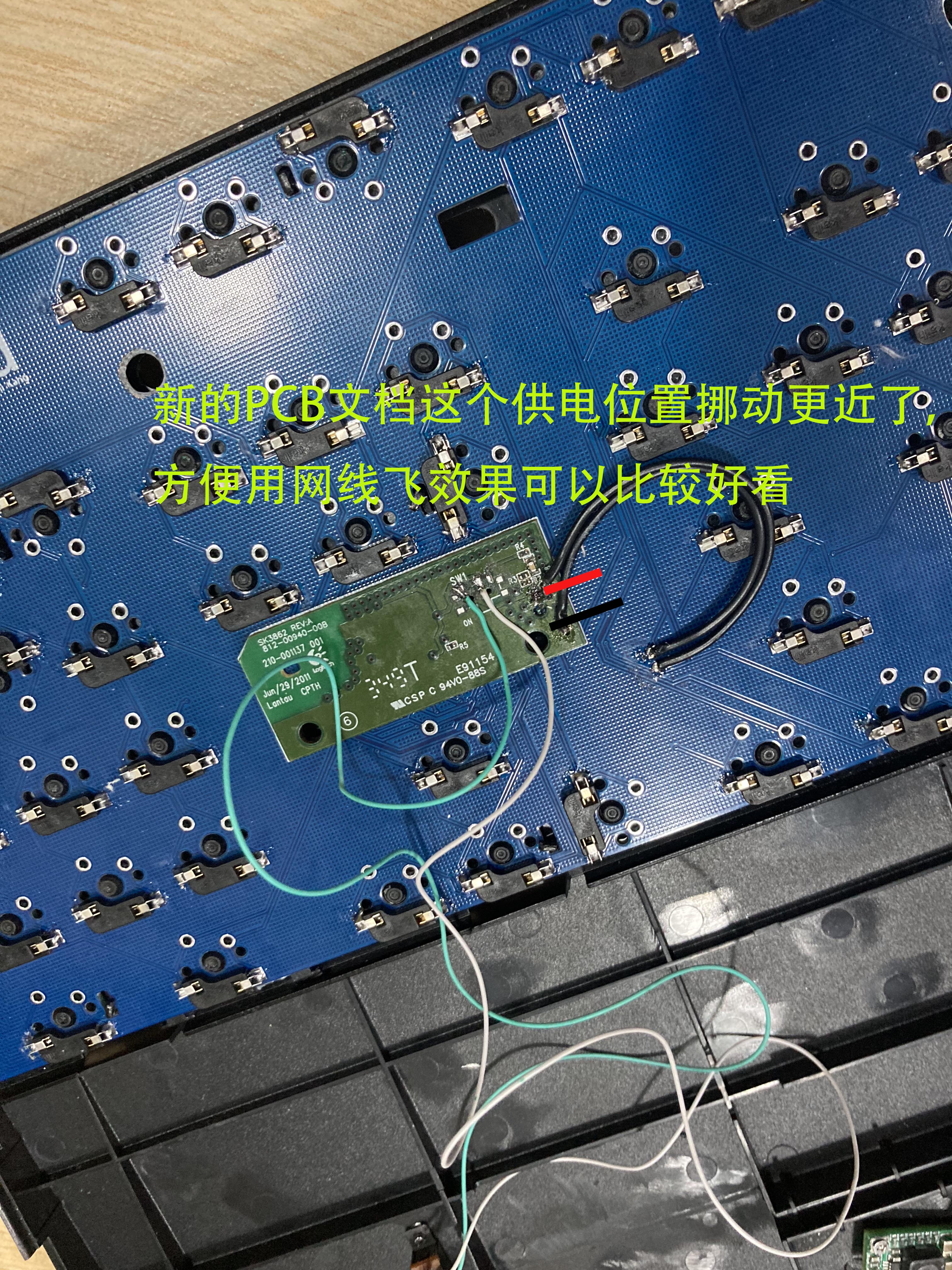 这个是主控DC电源连接位置测试挖洞比较容易接线/ (上面飞线位置是 另外一块键盘的键位定位塑料螺丝)