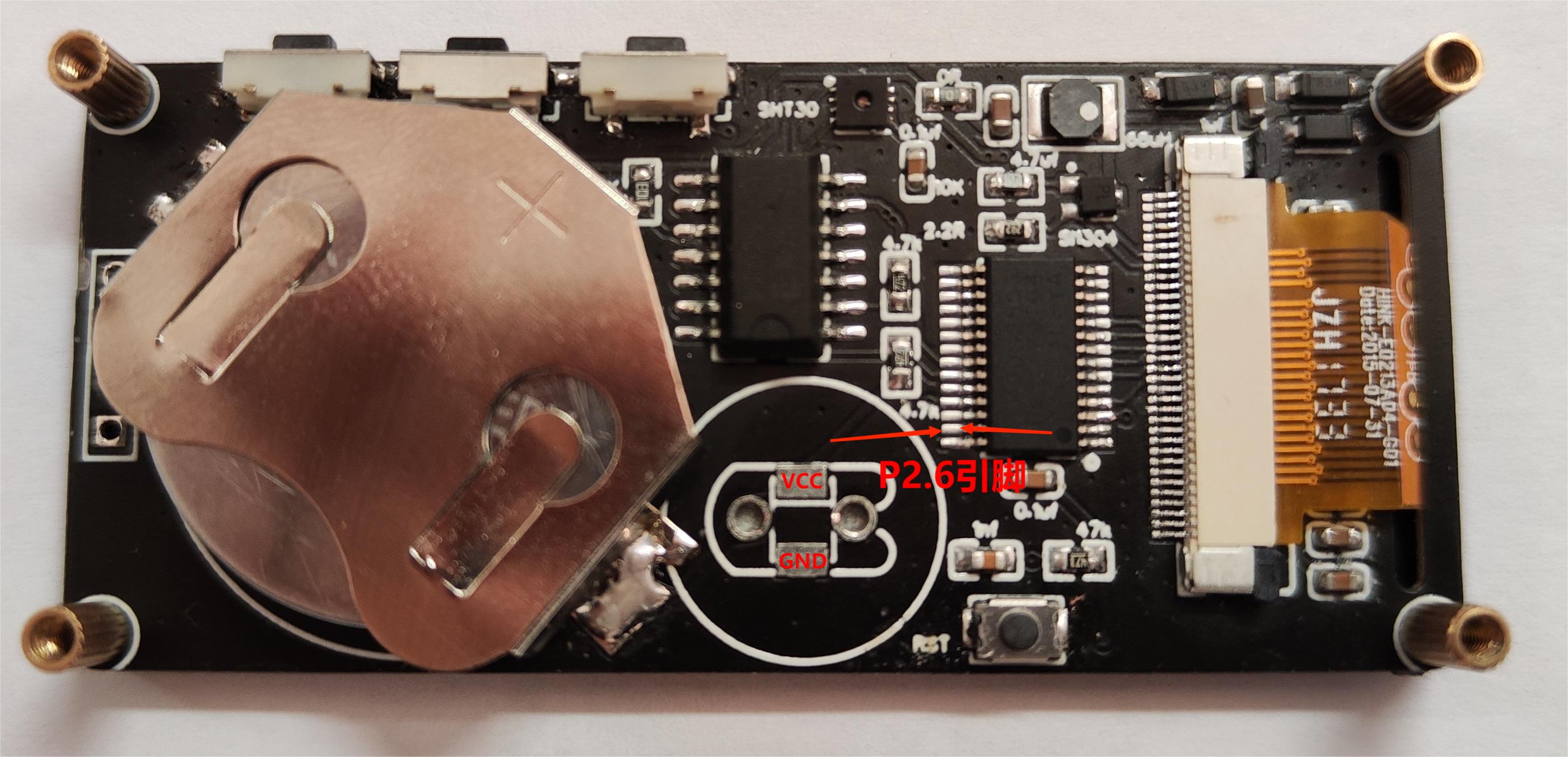 VCC、GND可自行选择焊接位置,P2.6按图示位置焊接(飞线)