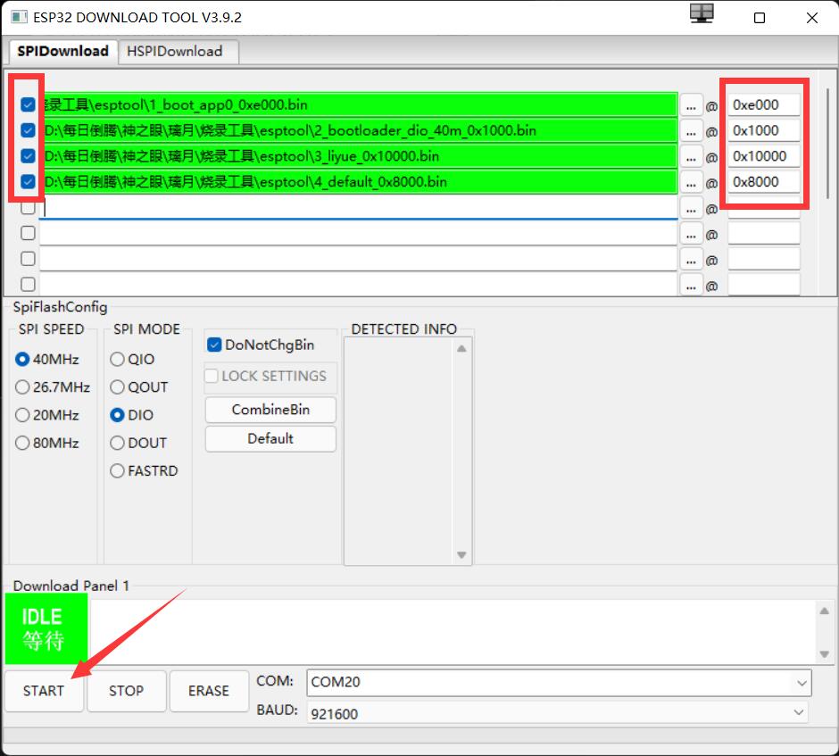 选择每个bin文件,以及填写后面的地址,填完之后在前面打勾,然后点START开始烧录,此时按住PCB上的BOOT键不放再按一下EN键即可进入烧录模式