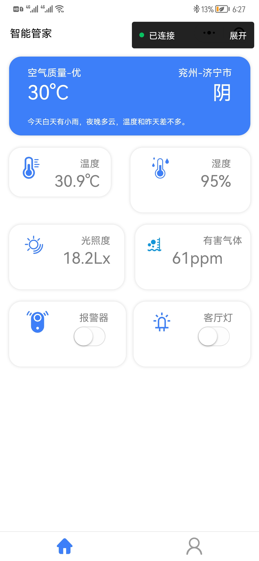 简介:1.可燃气体浓度和空气质量 检测 2.适宜温度、湿度提醒和报警。 3.光线检测(窗帘) 4.天气预报 5.夜光灯、应急照明灯, 6.APP小程序状态提示 7.电话求助和微信提醒(自动求助报警)开源协议