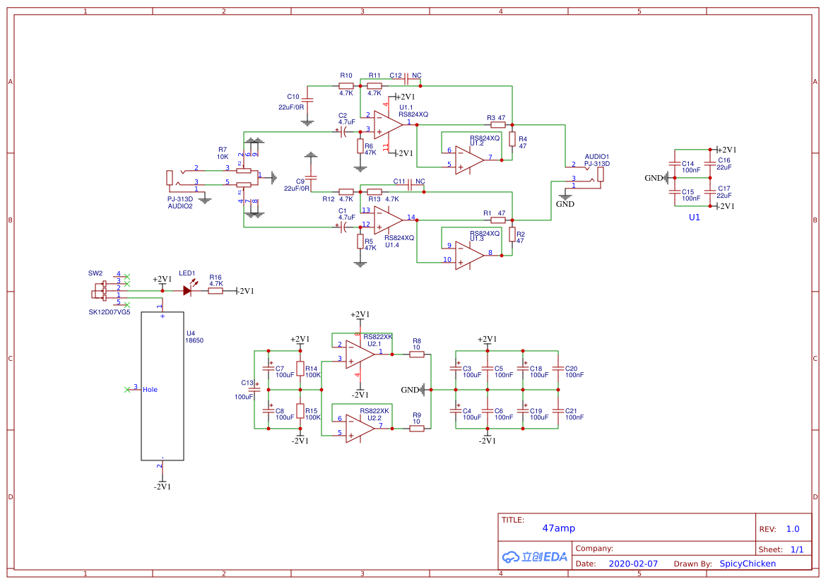 简介:一个单节锂电池供电的47架构的耳放,以及单电源转双电源电路开源协议