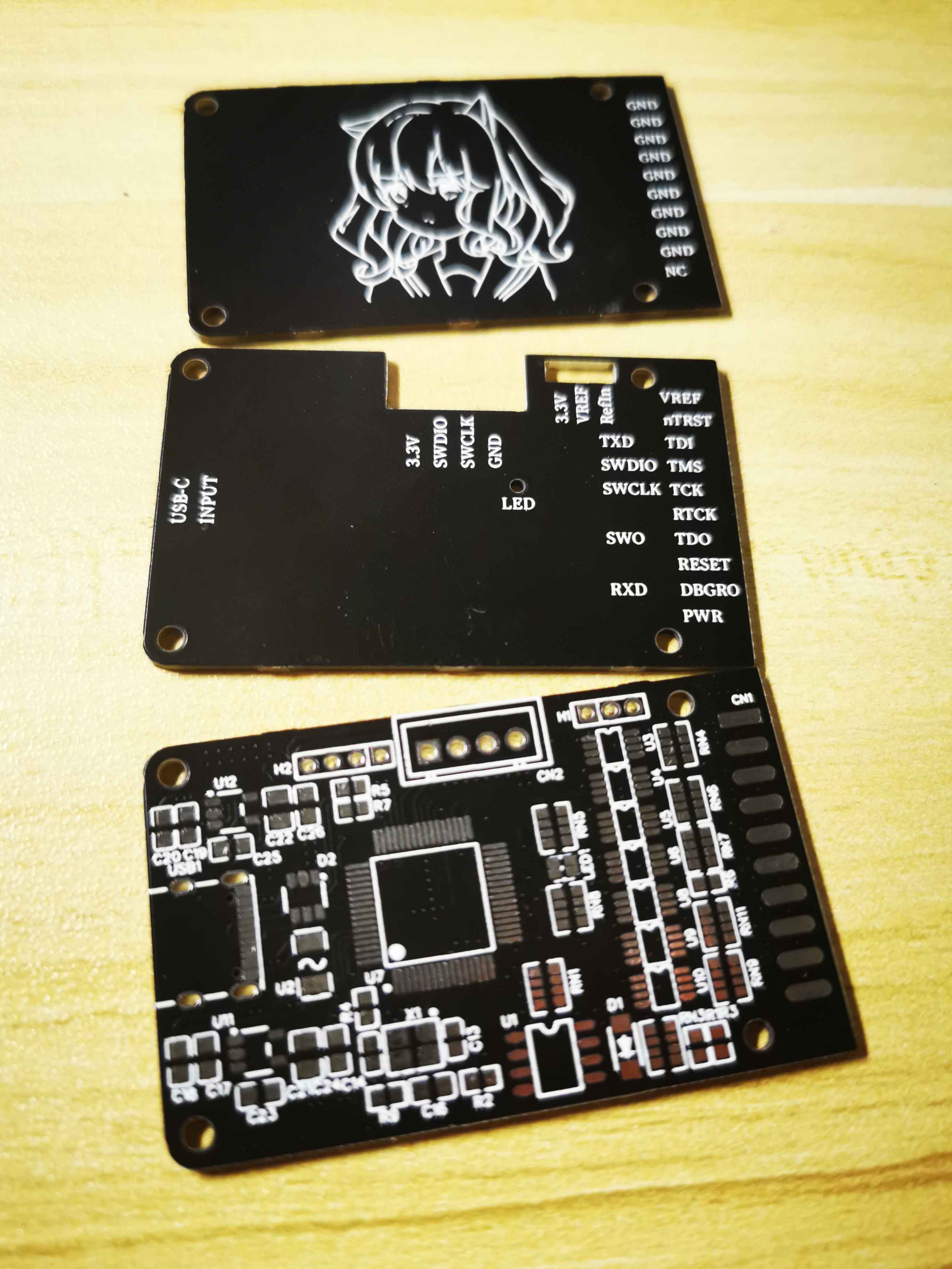 为了不让它裸奔(省钱,把上下盖板拼在一起了(总尺寸不超过10*10可以5元打样),上盖丝印上有各种接口的定义,下盖有大面积空白,各位艺术家可以自行创作