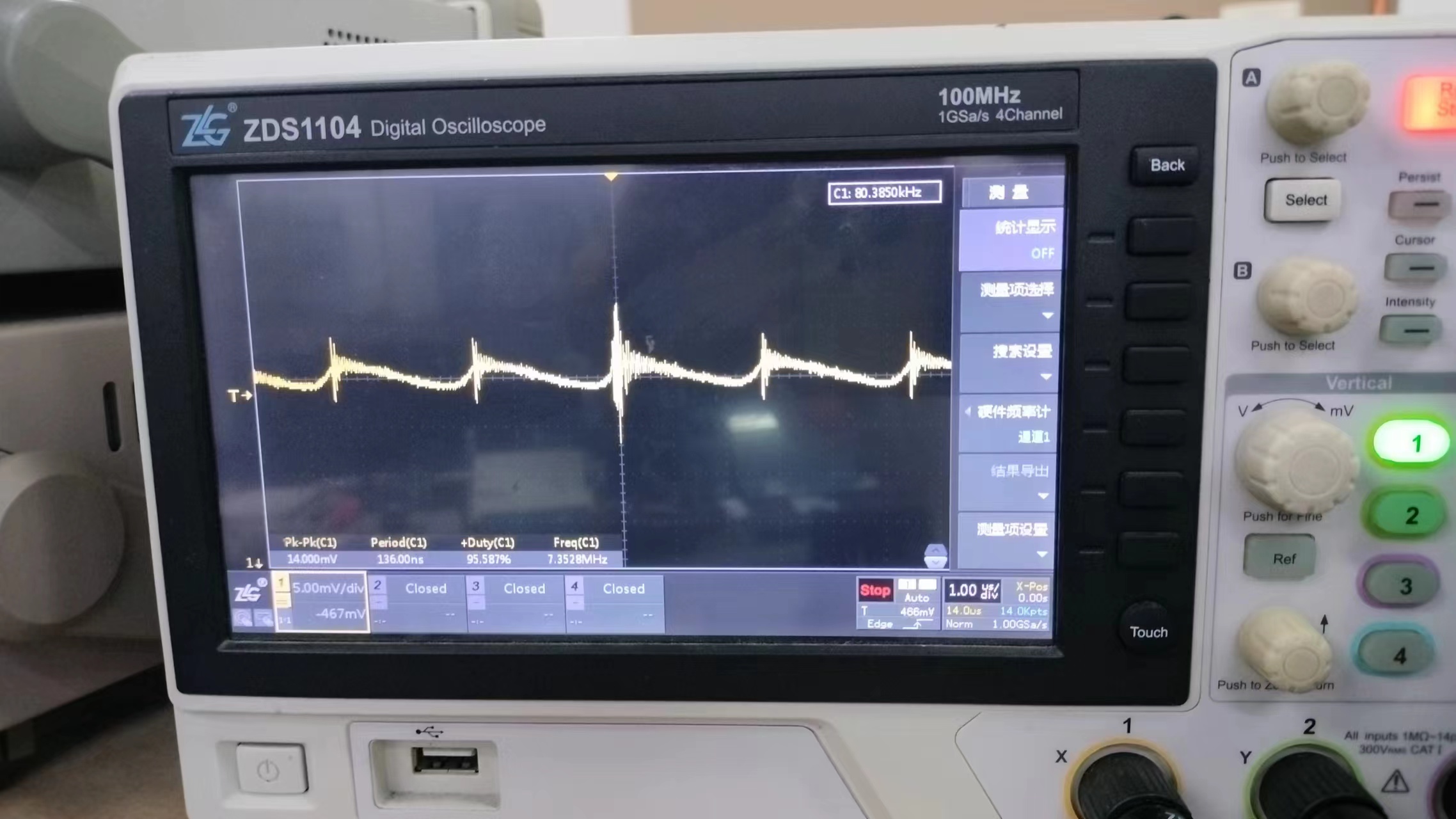 纹波测试(我没有使用正确的测试纹波的方法,并且后面才发现探头使用了10倍衰减,测试的时候没有发现,我还说纹波咋这么好。我使用的是鳄鱼夹做地回流,这个只能看个大概)