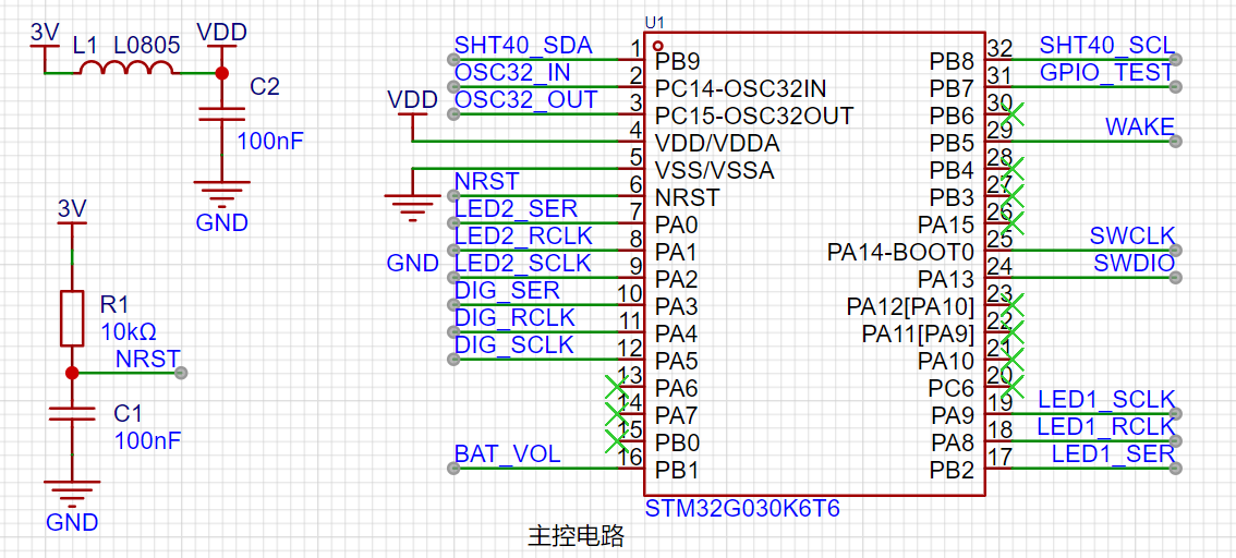 主控芯片采用STM32G030K6T6,使用L1的磁珠和C2的电容进行滤波。C1为复位电容,没有设计复位按键,在使用时可以用镊子夹住复位电容进行复位。