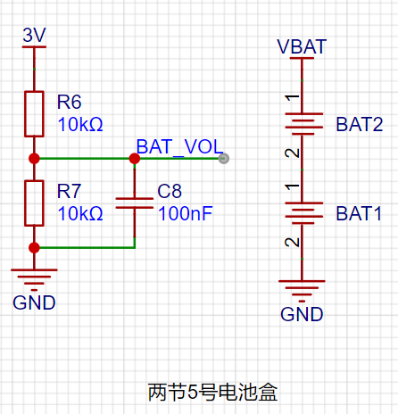 本项目采用两节5号电池供电,BAT_VOL为ADC采样使用(设计中没有体现),并且加入防反接保护,以防电池接反损坏电路。