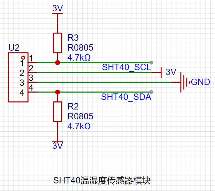温湿度传感器使用盛思瑞SHT40温湿度传感器模块,IIC通信,SCL、SDA外接上拉电阻。