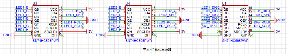 选用了SN74HC595PWR寄存器连接数码管,这样只需很少的主控芯片IO口就可以控制多个数码管。这里的LED1_X是控制第一个数码管显示的引脚,LED2_X是控制第二个数码管显示的引脚,LEDX_DIG是控制数码管共极性侧的引脚。