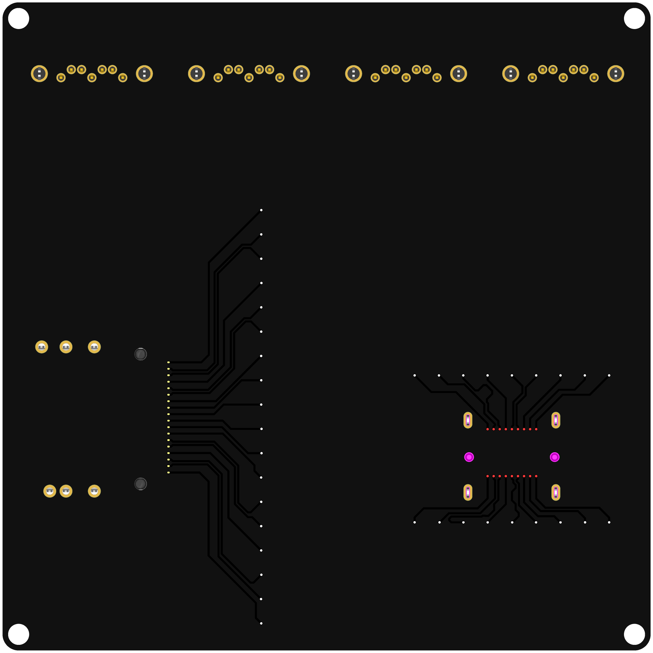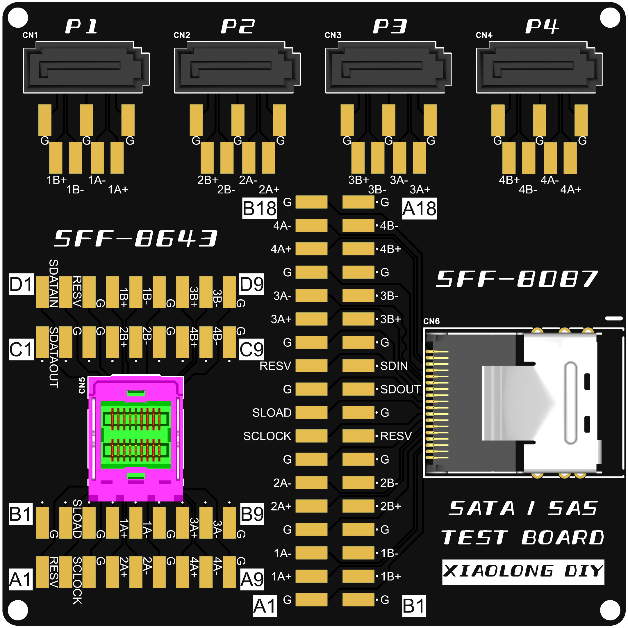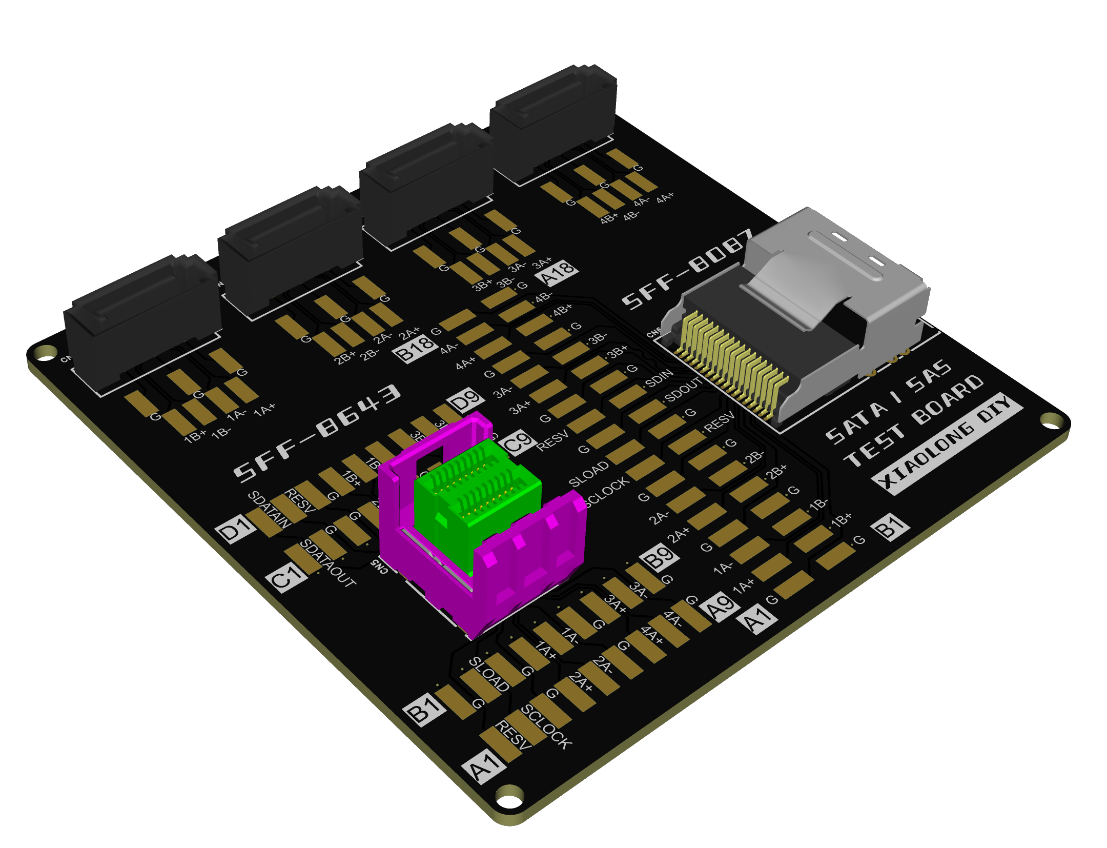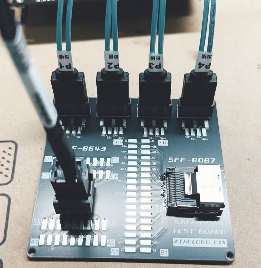 一块测试DIY背板SAS/SATA连接器焊接可靠性的板子,方便测试各个差分信号线的通断。板上有4个sata-7p、1个sff-8643、1个sff-8087。还需要买一条sff-8643转4sata、一条sff-8087转4sata、一条sff-8087转sff8643数据线。所有的焊盘信号都是独立的,包括GND。