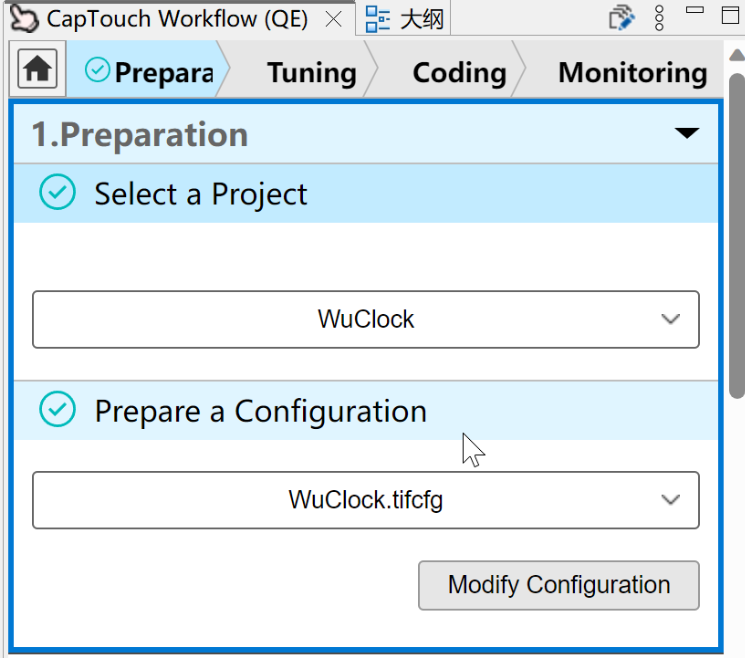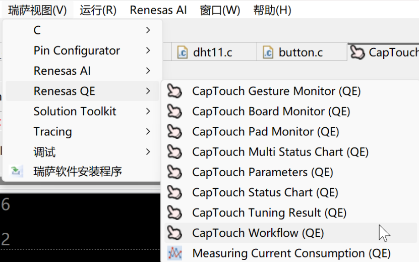 在使用串口进行调优时,按照课程教程,首先在“瑞萨视图>Renesas QE”中选择“CapTouch Workflow(QE)”打开工作流,选择对应的项目、并参考教程配置好电容式按钮。