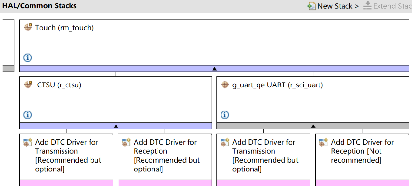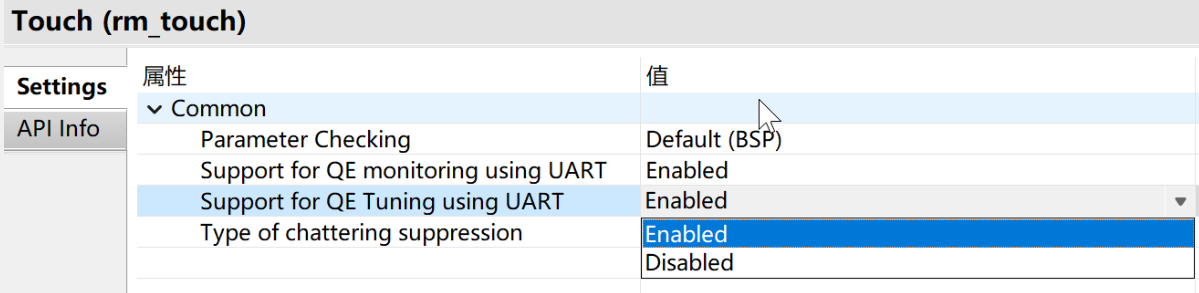 同时,需要在配置中调整原有串口配置,将之前配置的串口配置到touch堆栈上,并且选择Touch堆栈,在属性界面中将“Support for QE Tuning using”切换为“Enabled”。