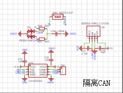 使用CA-IS3052G及B0505S-1WR3构成隔离电路,最高1Mbps通信速率(已测试),有效防止了电位差可能造成的芯片损坏,根据芯片手册CA-IS3052G具有5000Vrms的隔离能力,B0505S-1WR3也具有3000V的隔离能力,再加上额外添加的PESD1CAN在一般应用场景应该不存在问题了(PS:打样的板子b0505正负画错了,现已修正)。