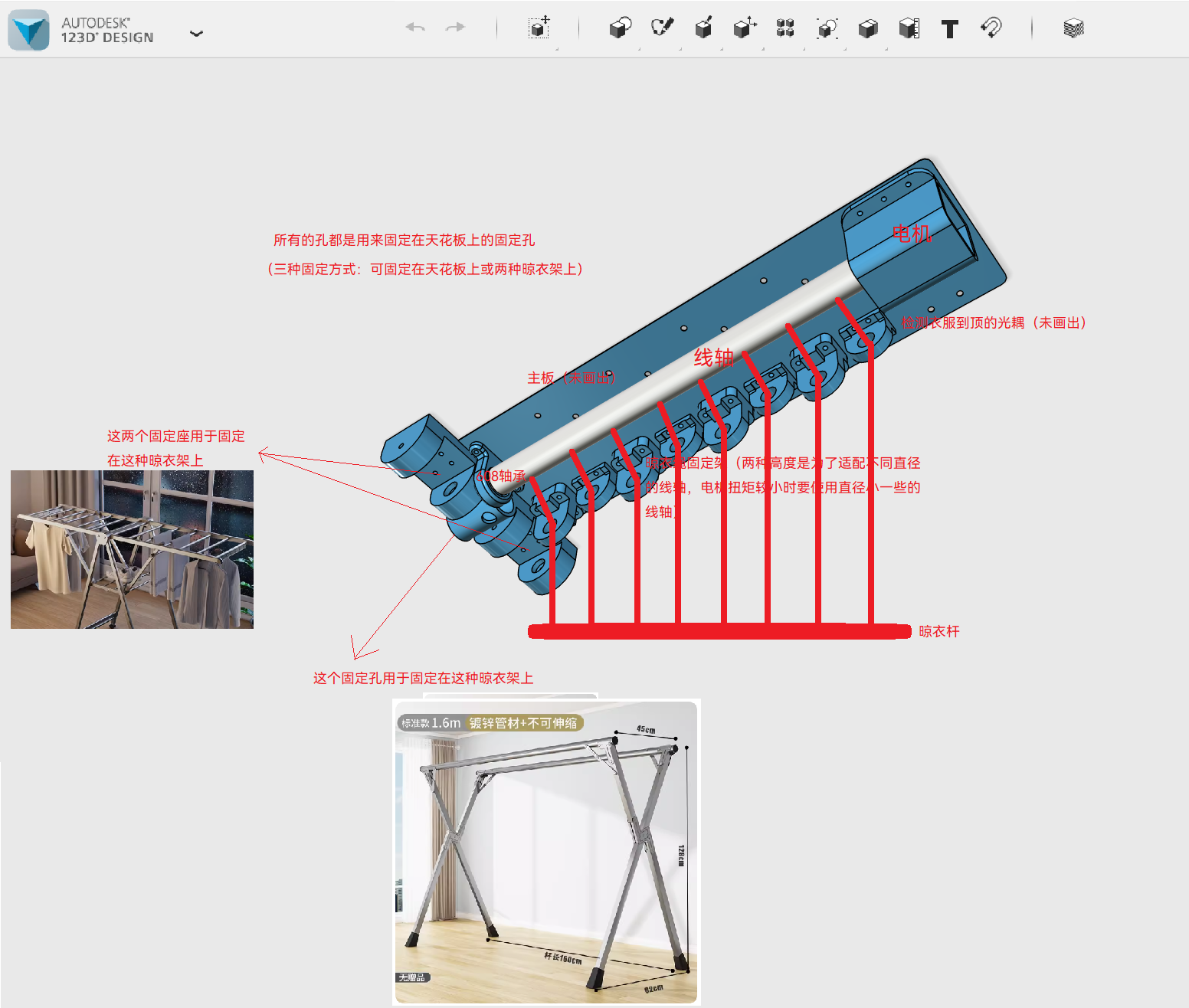 使用一个540减速电机(注:带有达到一定圈数自动触发的光耦)作为动力,带动3D打印的线轴,通过拉线的方法实现晾衣杆的升降,预期承重25kg